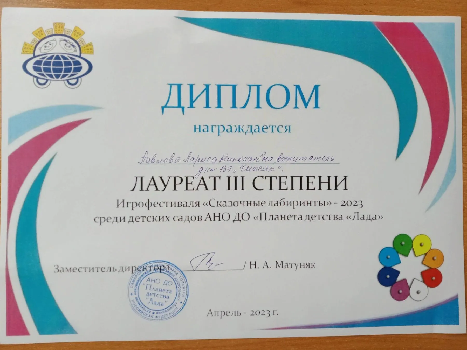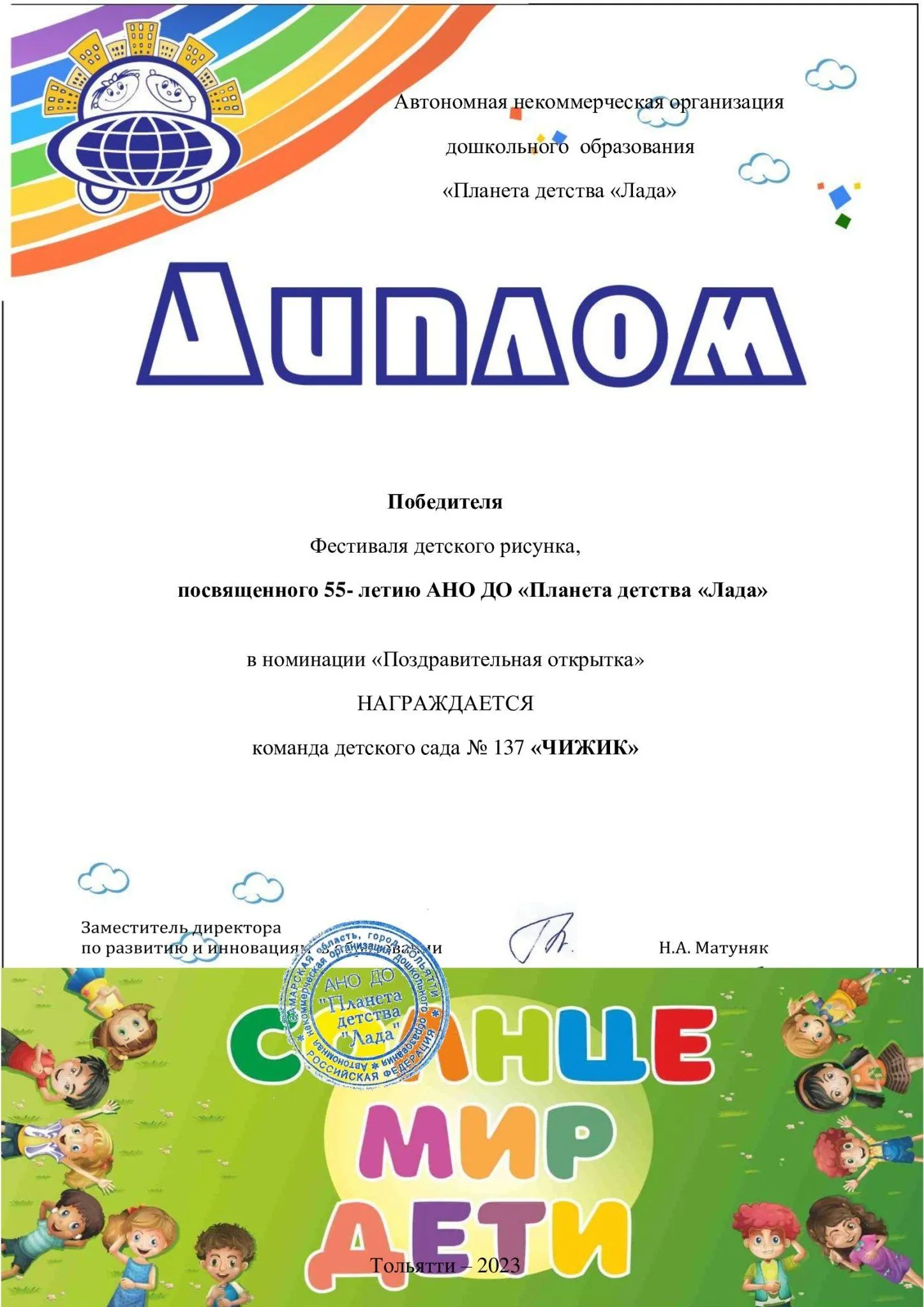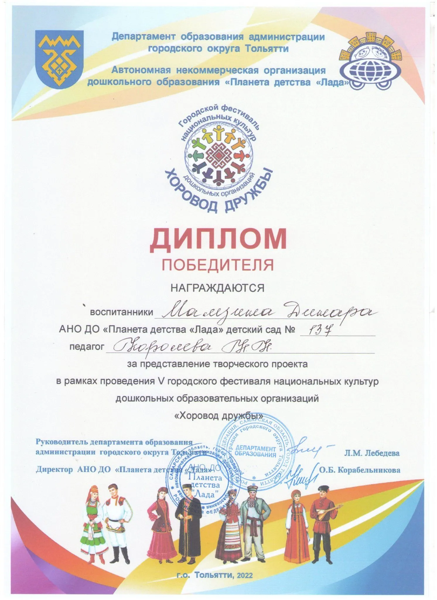 Воспитанники детского сада под руководством педагогов ежегодно принимают активное участие в различных мероприятиях Всероссийского, городского уровня, на базе АНО ДО «Планета детства «Лада», являются неоднократными призёрами и лауреатами.