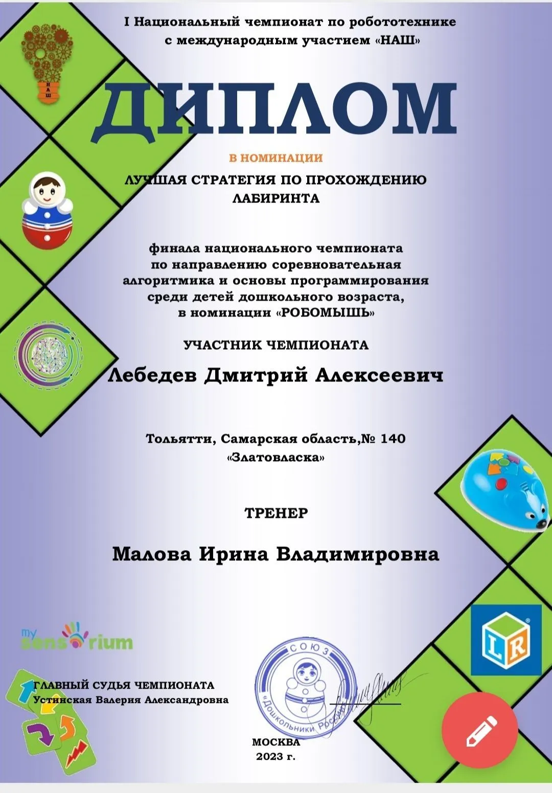 | «Первые шаги в алгоритмику» | 5-6 лет | Дополнительная общеобразовательная общеразвивающая программа технической направленности «Первые шаги в алгоритмику» для детей 5 - 6 лет. Авторы: Ерыкова Н.А., Малова И.В. | подгрупповая | 1 | 91 |