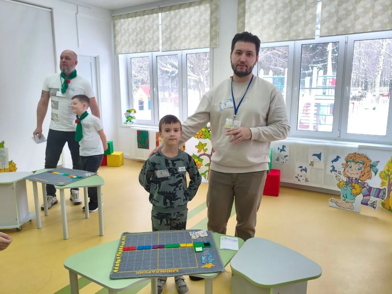 Наш детский сад с честью представили Максим М., его папа Алексей Витальевич, Саша П., его папа Иван Максимович. Их команды слаженно, быстро и точно прошла все этапы, посвященные «Дню защитника Отечества». Для выполнения интересных заданий участники использовали развивающие пособия В. Воскобовича: «Чудо-крестики 2», «МиниЛарчик», «Логоформочки 5», «Нетающие льдинки».