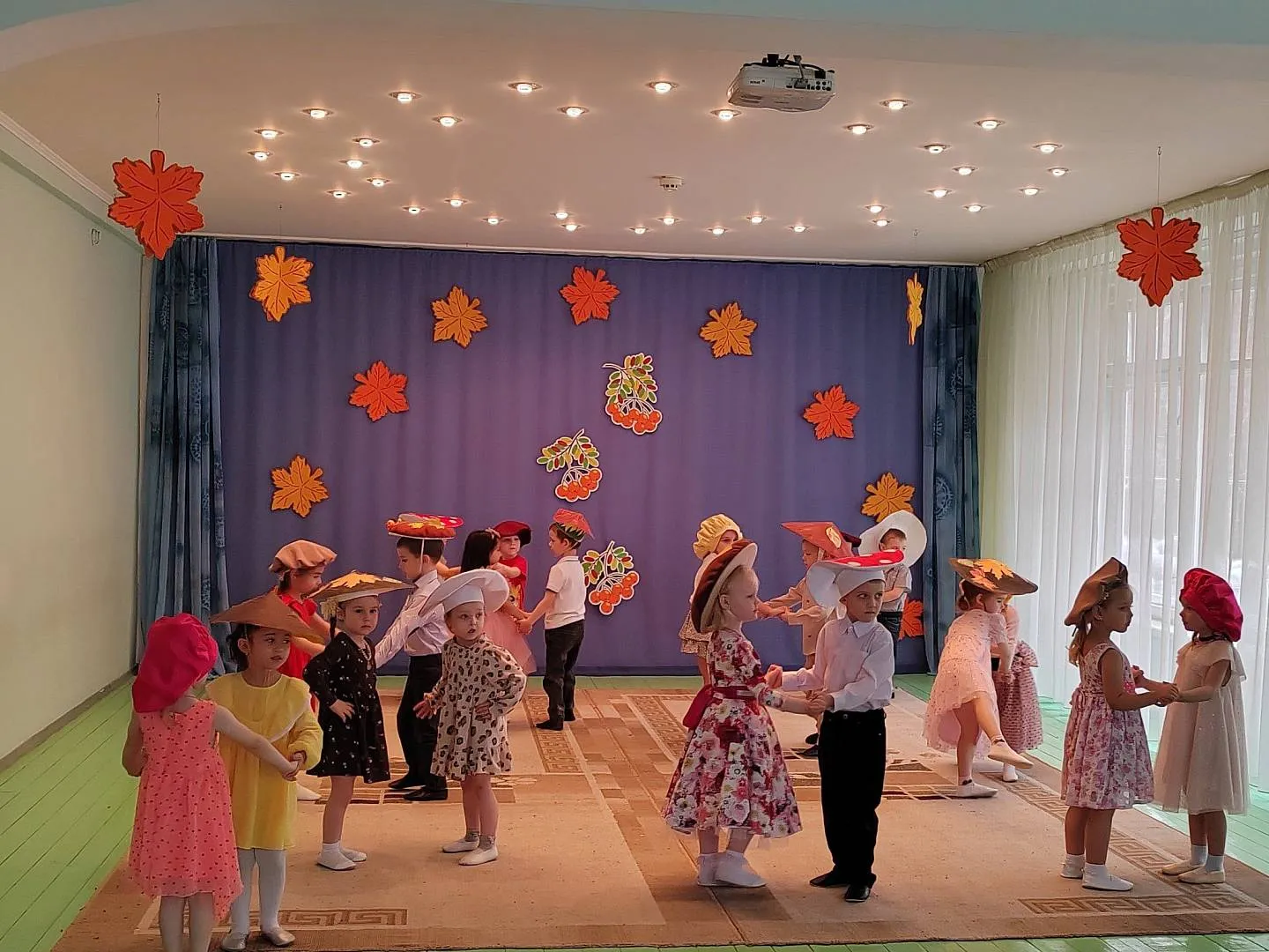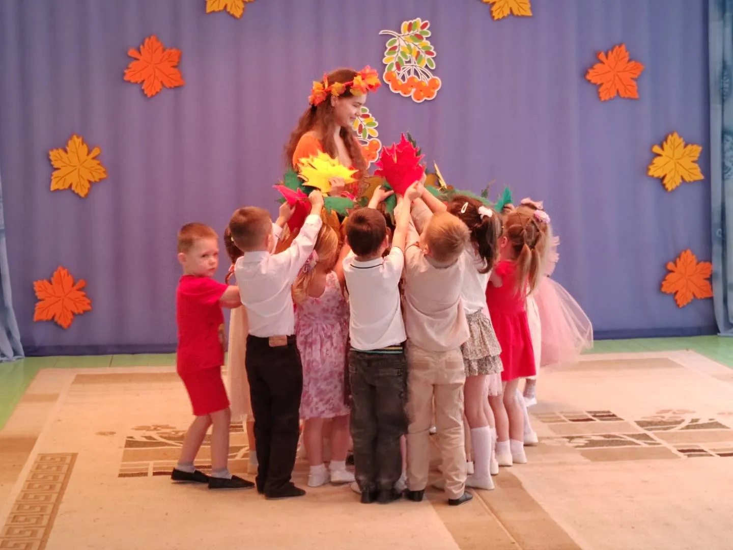 Зал наполнился звонкими голосами, когда дети исполнили песню об осени, дождике и золотых листочках. А потом, словно листья, подхваченные ветром, ребята кружились в красивом осеннем танце с разноцветными листочками.
