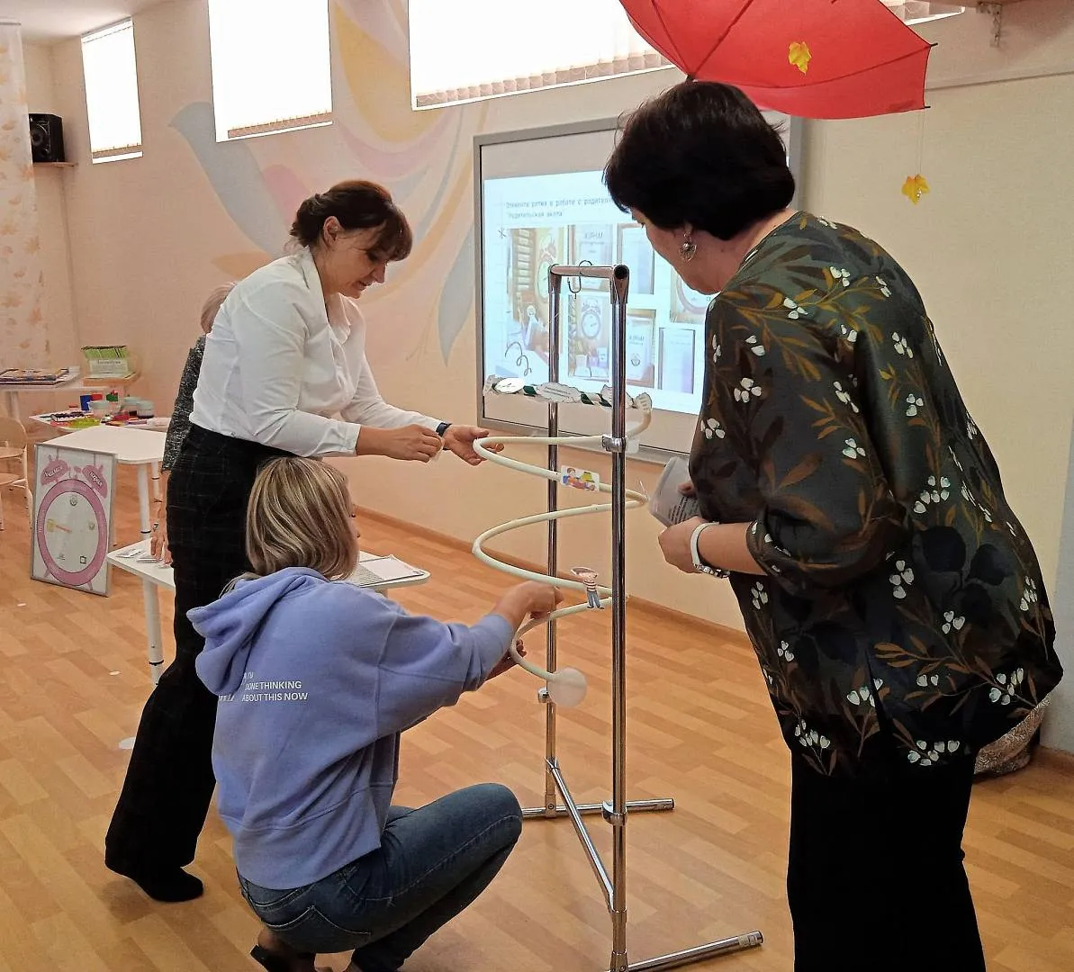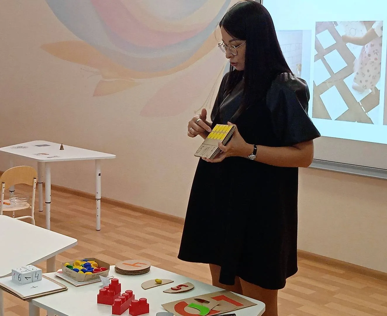 Учителя-дефектологи из детского сада №173 «Василёк» поделились авторскими материалами в использовании LED-стола, как эффективного оборудования в работе с детьми с нарушениями зрения. Они представили спектр упражнений и игр с различными материалами: цветной мыльной пеной, цветными прозрачными пластинами и другими. Педагоги познакомили слушателей с шариками-орбизами и показали, как с ними можно играть: «выращивать», менять цвет красителями и сортировать.
