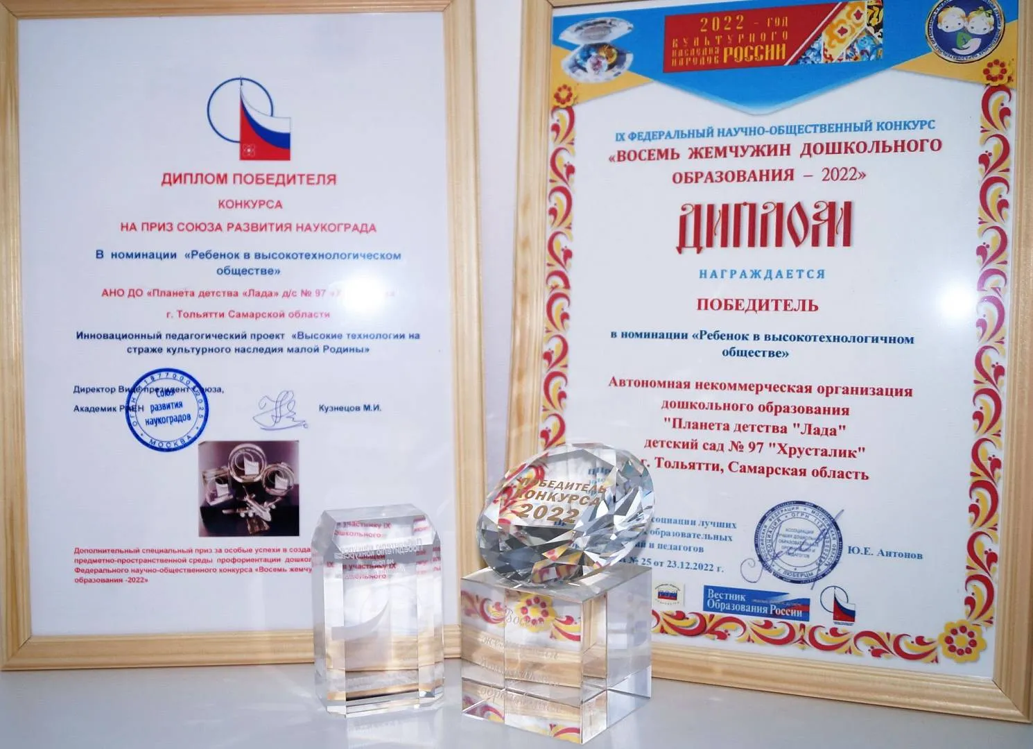 И вот подведены итоги IX Федерального научно-общественного конкурса «Восемь жемчужин дошкольного образования – 2022». Детский сад № 97 «Хрусталик» стал победителем конкурса в номинации «Ребенок в высокотехнологичном обществе» с проектом «Роботы–помощники природы» - Высокие технологии на страже культурного наследия Малой Родины». Наш проект также был отмечен специальным призом от Союза развития наукоградов.