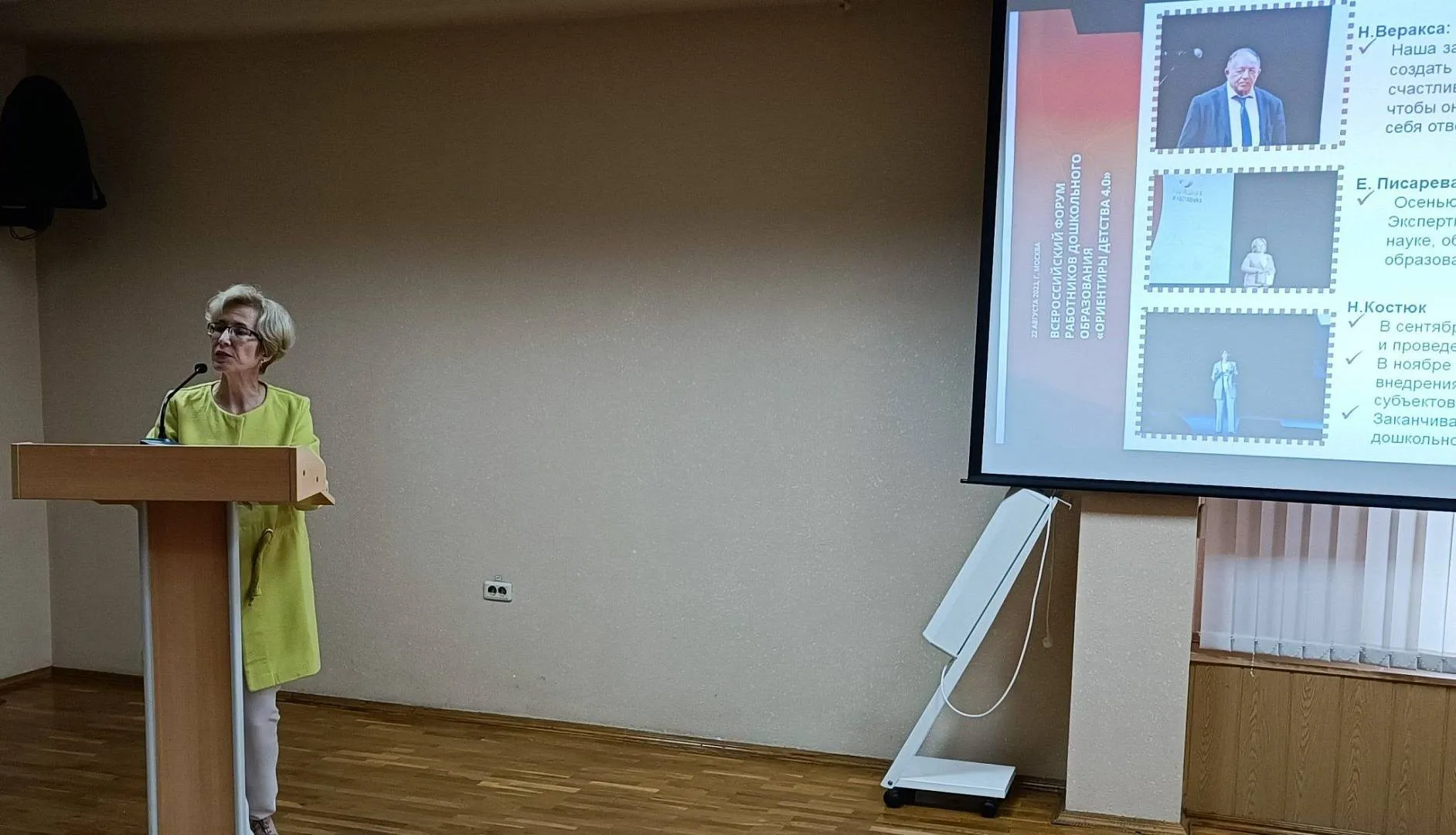 Музяева Н.А., начальник отдела сопровождения и организации образовательной деятельности, поделилась впечатлениями от участия во Всероссийском Форуме работников дошкольного образования «Ориентиры детства 4.0», прошедшем 22 августа в г.Москва. Она отметила, что позитивная динамика роста интереса педагогов дошкольного образования России к Форуму подтверждает важные тенденции: осознание исключительной важности дошкольного возраста для формирования основы личности ребенка; уважительное отношение к профессии педагога-дошкольника со стороны государства и общества; потребность профессионального сообщества совместно формулировать и решать возникающие проблемы.