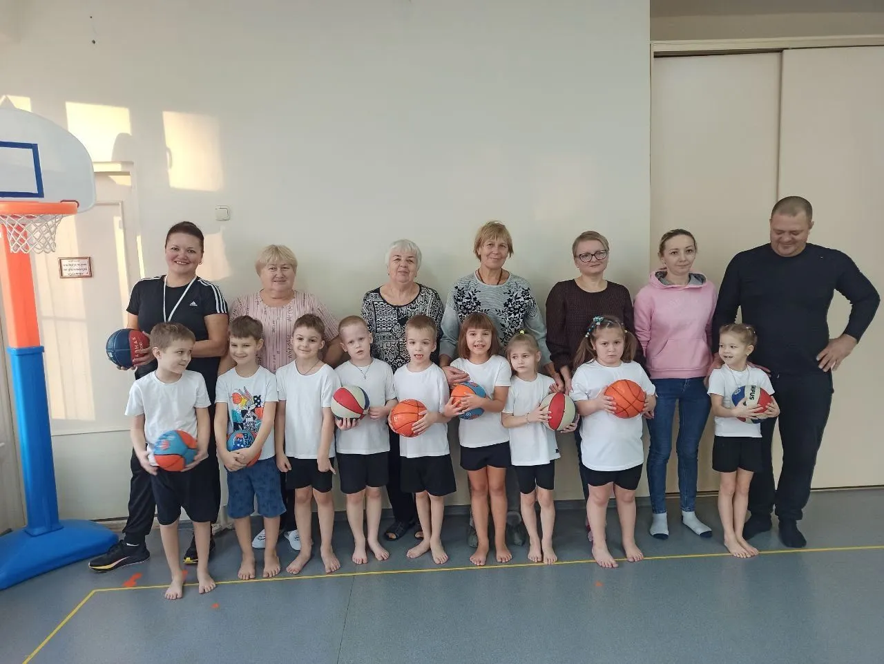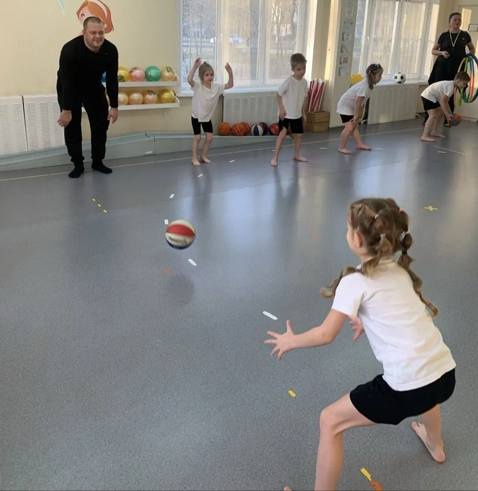 - Блеснули спортивной формой на физкультуре с мячом.