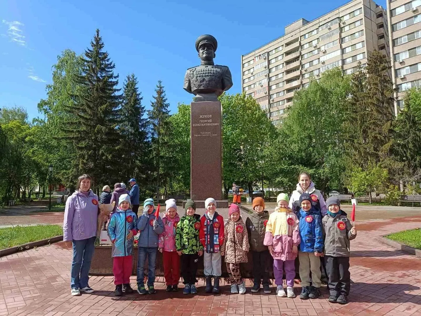 Также по традиции дошкольники вместе с воспитателями возложили цветы памятнику маршала Жукова в сквере 11 квартала.