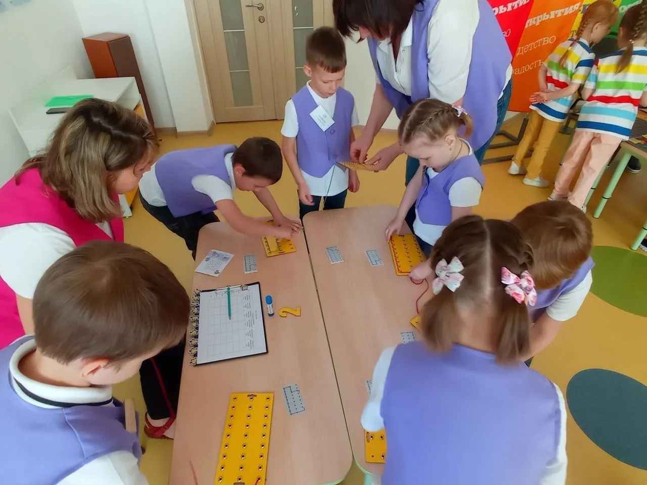 Путешествуя по таинственным и загадочным сказочным лабиринтам и выполняя интересные задания, дети старших групп запускали в космос ракету, «озеленяли» наш город и «возвращали» птиц в Фиолетовый лес, складывали затейливые узоры. Ребята подготовительных к школе групп отправлялись в морское путешествие, а потом совершали увлекательную поездку на логопоезде и интересную экскурсию по нашему городу, разгадывали головоломки и ребусы, строили детский сад. Путешествуя от станции к станции мастерской ворона Метра, дошколята с большим интересом заполняли наклейками- волшебными плодами самые настоящие Паспорта путешествия.