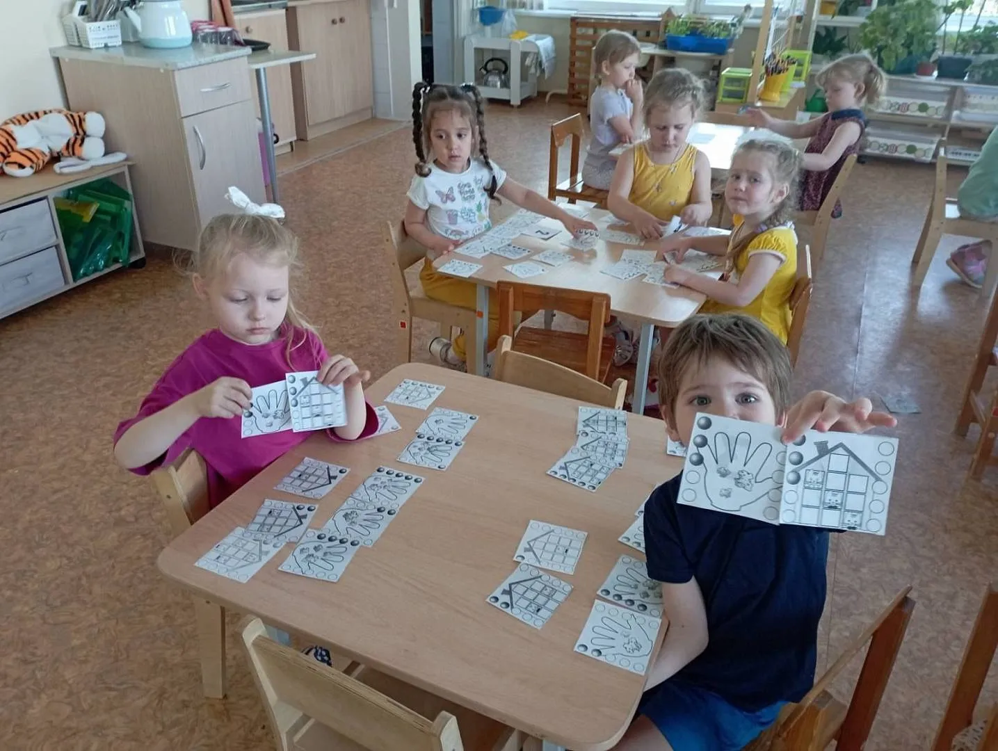 Дети средней группы 92 играли в игру-считалку "Шел домой Глеб" (находили количество съеденных Глебом крошек и увиденных им кошек), помогали Ёжику-единичке и Зайчику- двойке пройти по лабиринту цифр в свои номера в гостинице, а также превращали волшебный квадрат в разные фигурки. Ребята 93 группы под командованием капитана Гуся стирали, а потом развешивали разноцветные флажки на мачты караблика Брызг-брызг, закрепляя счёт и цвет. Мальчики и девочки 94 группы вместе с малышом Гео и пауком Юком играли разноцветными паутинками на чудесной полянке золотых плодов - "Геоконте". Они познакомились с треугольником, строили разные многоугольники.