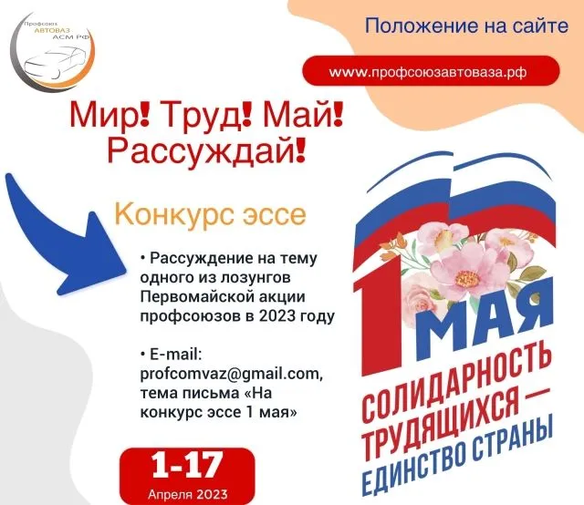 Подведены итоги конкурса творческих работ – эссе «Мир! Труд! Май! Рассуждай!». Конкурс посвящен Первомайской акции профсоюзов в 2023 году и направлен на осмысление работниками основных лозунгов этой акции. Присланы разносторонние рассуждения. Было интересно, какие лозунги вы выберете и как их «прочитаете» через себя.