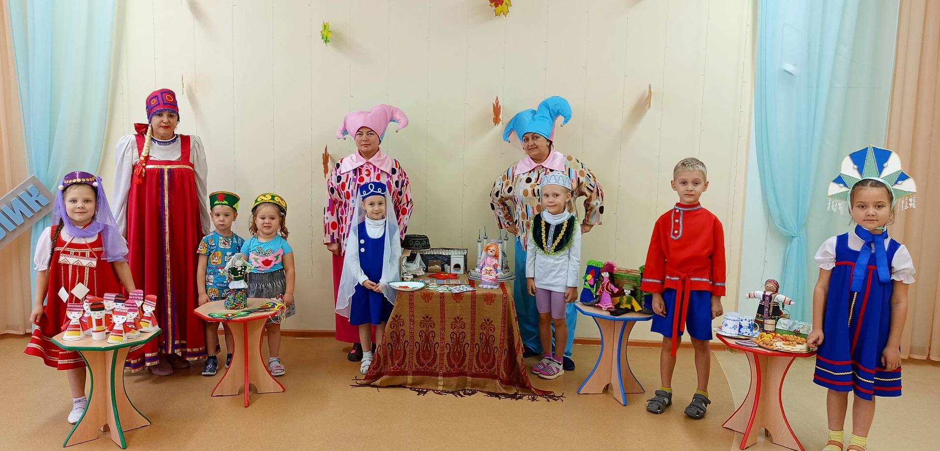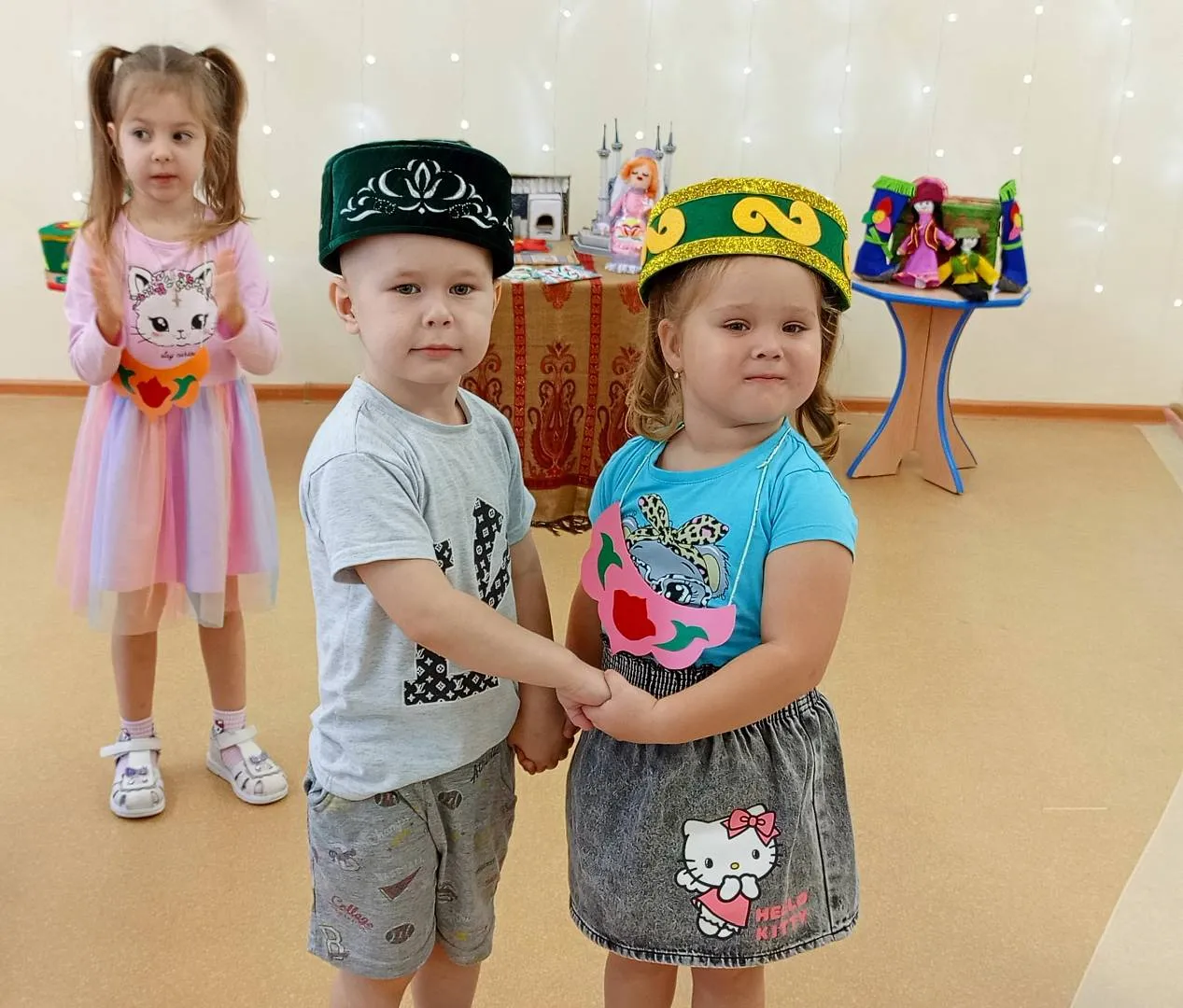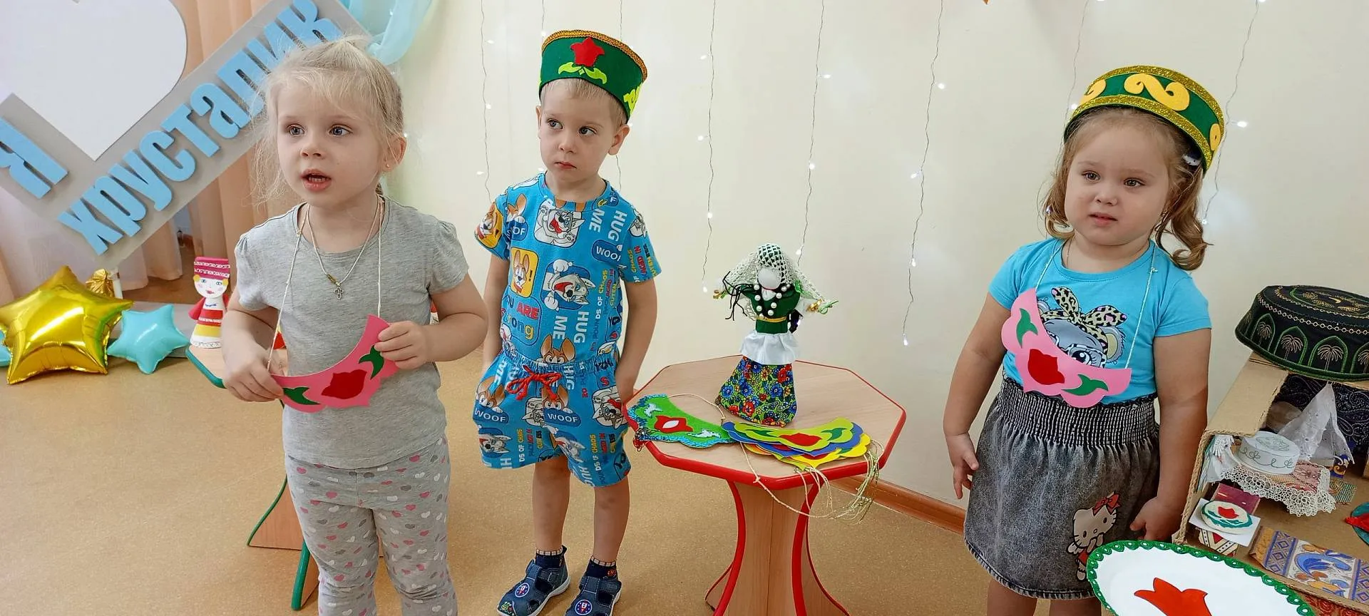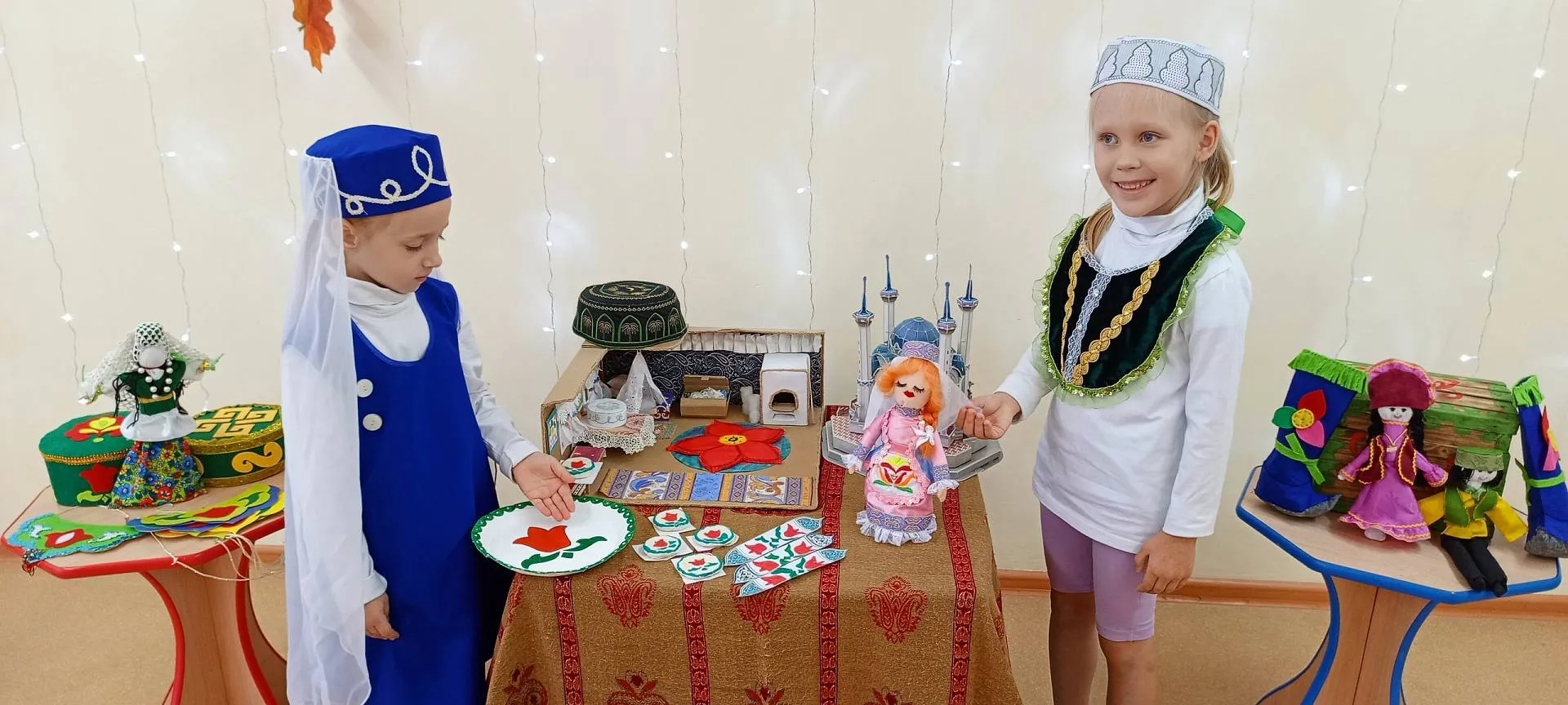 Сегодня, в рамках проведения фестиваля «Хоровод дружбы», в нашем детском саду прошла ярмарка-выставка результатов совместной с детьми проектной деятельности. Звучала весёлая музыка, дети в национальных костюмах представляли разнообразные поделки, рассказывали о своих работах и работах своих друзей. Все вместе водили хороводы, пели песни и играли в народные игры. В процессе проведения ярмарки-выставки, путём голосования определились 3 лучших творческих продукта.