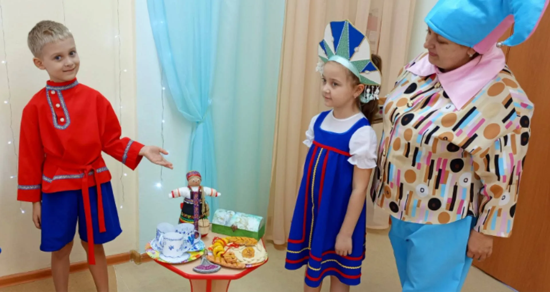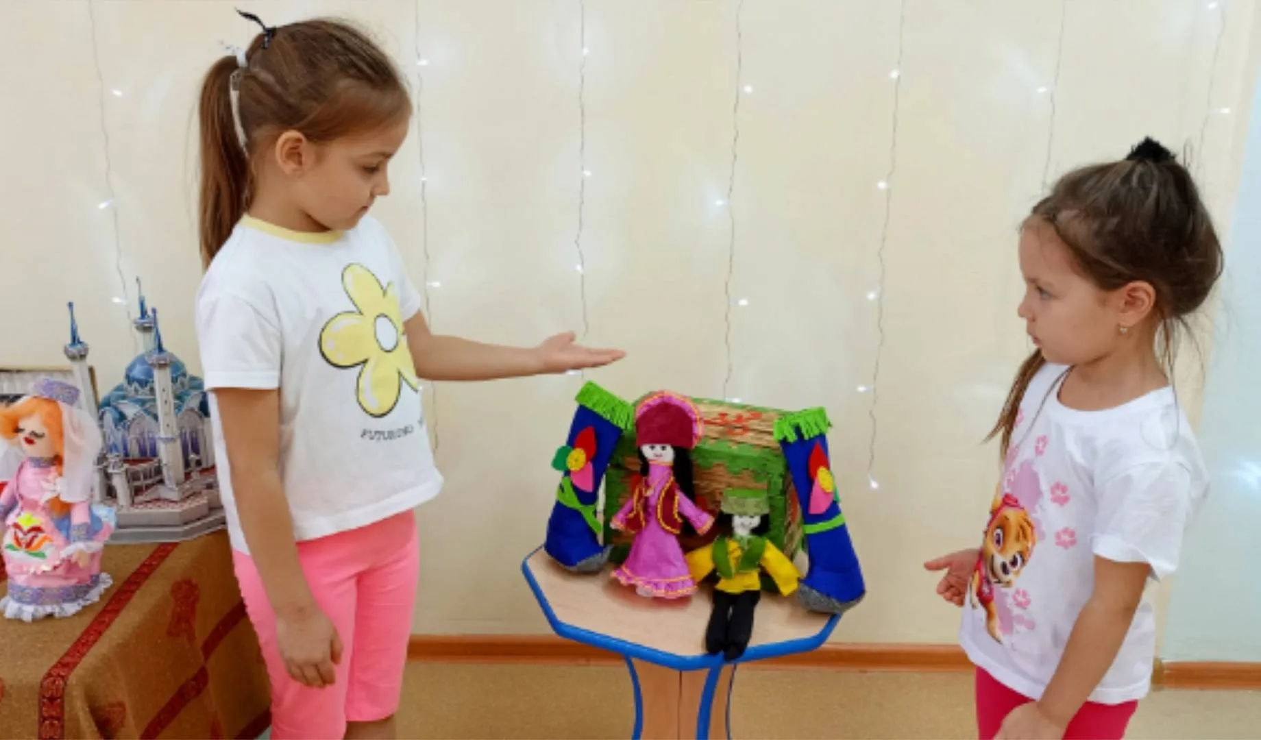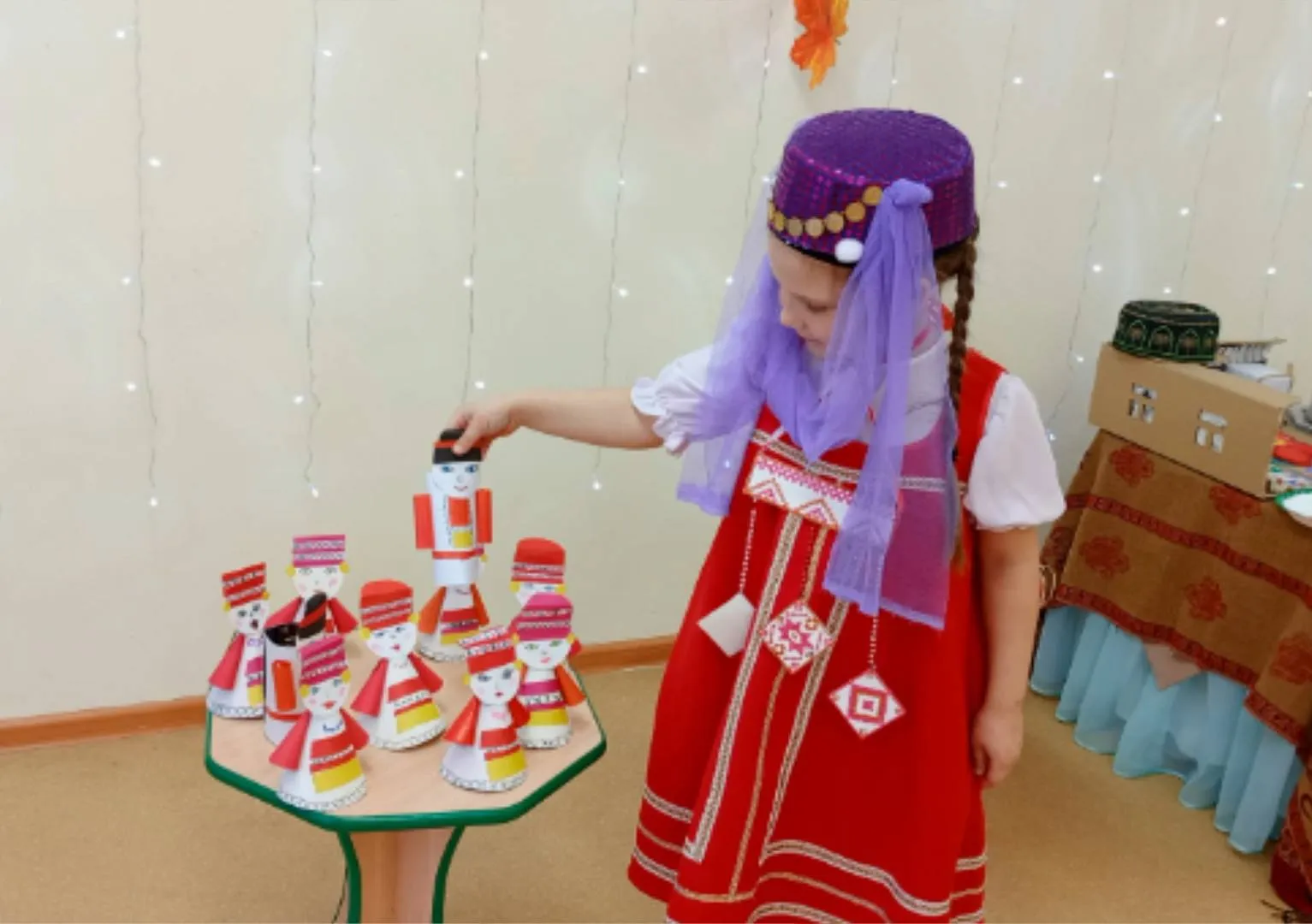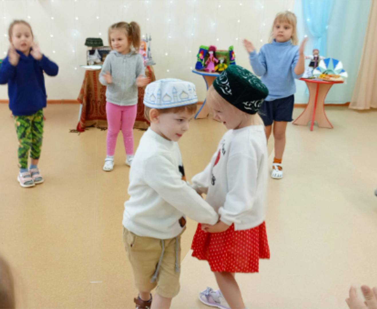 Сегодня, в рамках проведения фестиваля «Хоровод дружбы», в нашем детском саду прошла ярмарка-выставка результатов совместной с детьми проектной деятельности. Звучала весёлая музыка, дети в национальных костюмах представляли разнообразные поделки, рассказывали о своих работах и работах своих друзей. Все вместе водили хороводы, пели песни и играли в народные игры. В процессе проведения ярмарки-выставки, путём голосования определились 3 лучших творческих продукта.