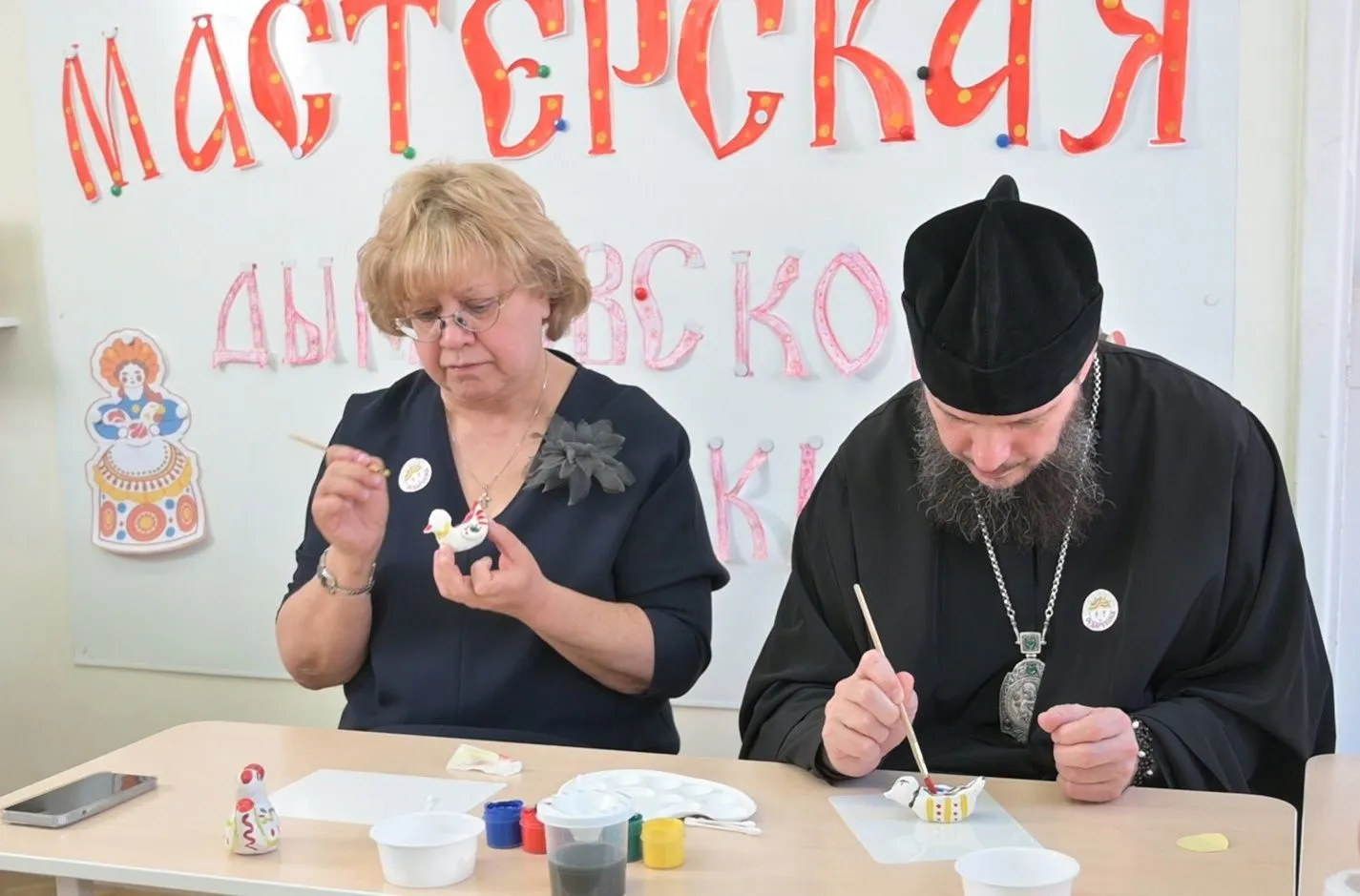 Примерив на себя роль мастеров, наши воспитанники предложили гостям вместе окунуться в народные промыслы и расписать глиняные заготовки по мотивам дымковской игрушки. Занятые столь приятным и интересным делом, ребята приобщались к удивительному явлению радости труда.