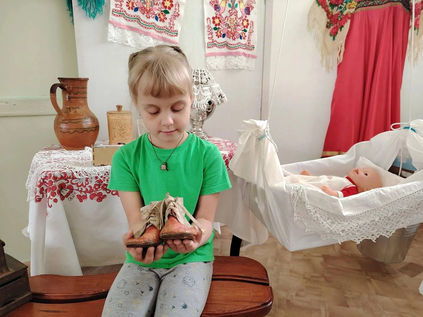 Наши воспитанники смогли прикоснуться к настоящим предметам из прошлого: это и старинный утюг, и коромысло, и чугунные котелки и ещё много-много чудесного! Ребята с удовольствием послушали истории о русской печке и изготовлении лаптей, покачали люльку и примерили русские народные сарафаны.