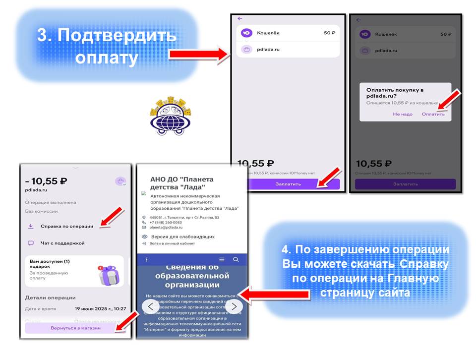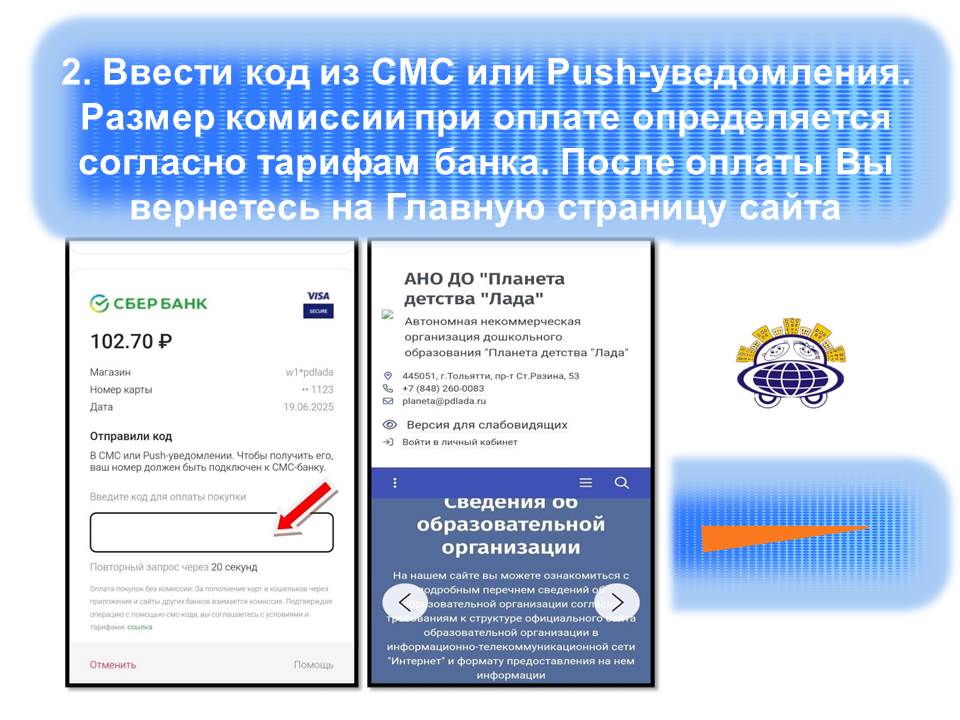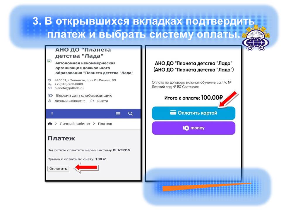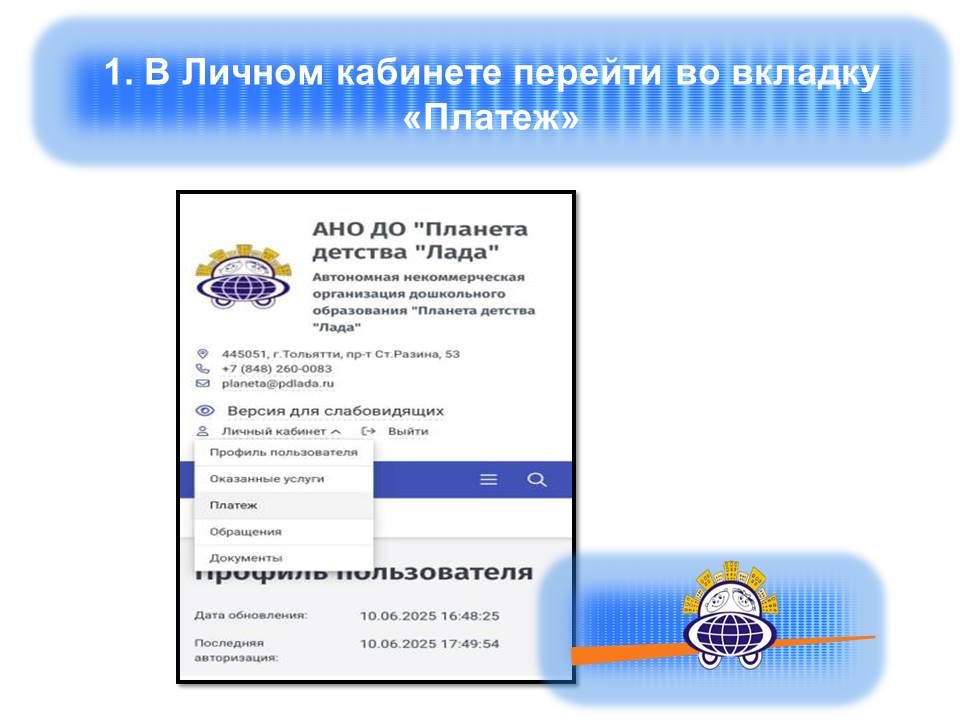Ответ: На сайте АНО ДО «Планета детства «Лада» предусмотрена возможность оплаты за услуги детского сада. Для этого на Главной странице сайта необходимо Войти в личный кабинет. Далее, следуя приведенной инструкции (см. фото), совершить платеж.