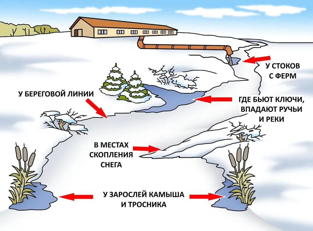 Если в течение нескольких дней температура не опускается ниже нуля, то прочность уменьшается на 25%. Тонкий лед обычно находится около зарослей камышей, кустов и деревьев, растущих возле берегов. Требуется осторожное поведение возле прорубей, которые могут быть невидными, если их запорошит снег.