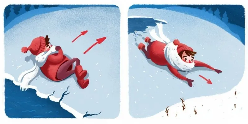3. Когда тело окажется на поверхности, следует перекатиться со спины на живот и отползать от полыньи подальше, желательно туда, откуда вы пришли: лёд вокруг провала хоть и хрупкий, но там, где вы стояли, он уже вами проверен. Ни в коем случае не вставайте на ноги.
