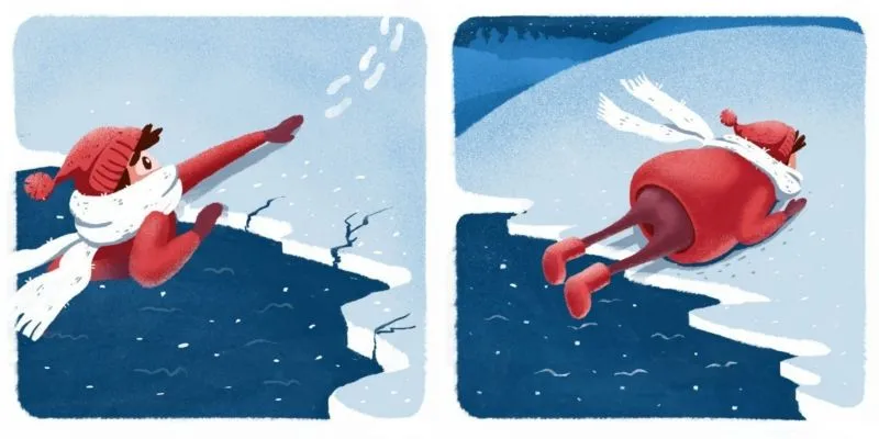 Если появилось ощущение, что лёд начинает вскрываться, то немедленно нужно прекратить ходьбу, не делать резких движений и аккуратно распластаться по поверхности, чтобы распределить вес тела по более широкому участку льда и затормозить разлом. Если с собой есть телефон, то лучше позвонить в МЧС.