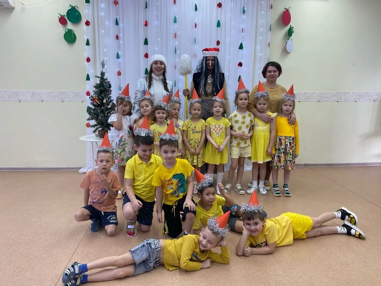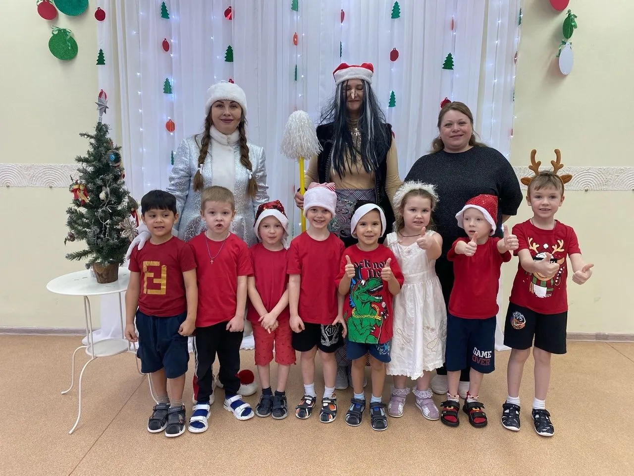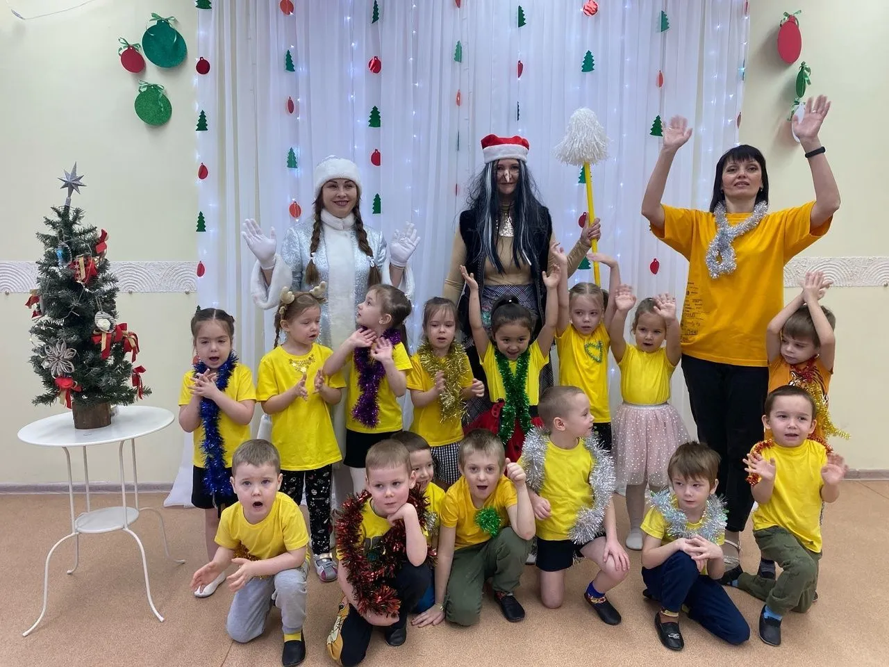 Ребятам предстояло пройти веселые и непростые испытания: представить свою команду, выполнить каверзные задания бабы яги и конечно же посоревноваться на лучший танец со Снегурочкой.