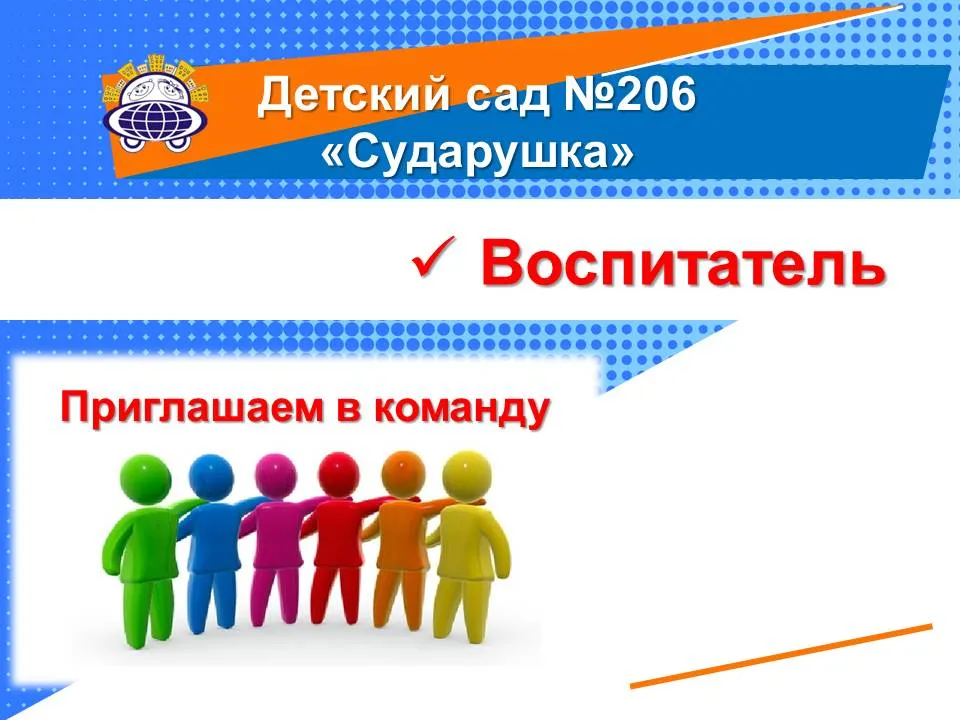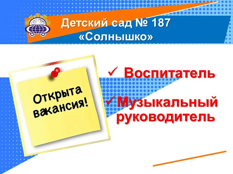 Детские сады 187 "Солнышко" и 206 "Сударушка" приглашают на работу: