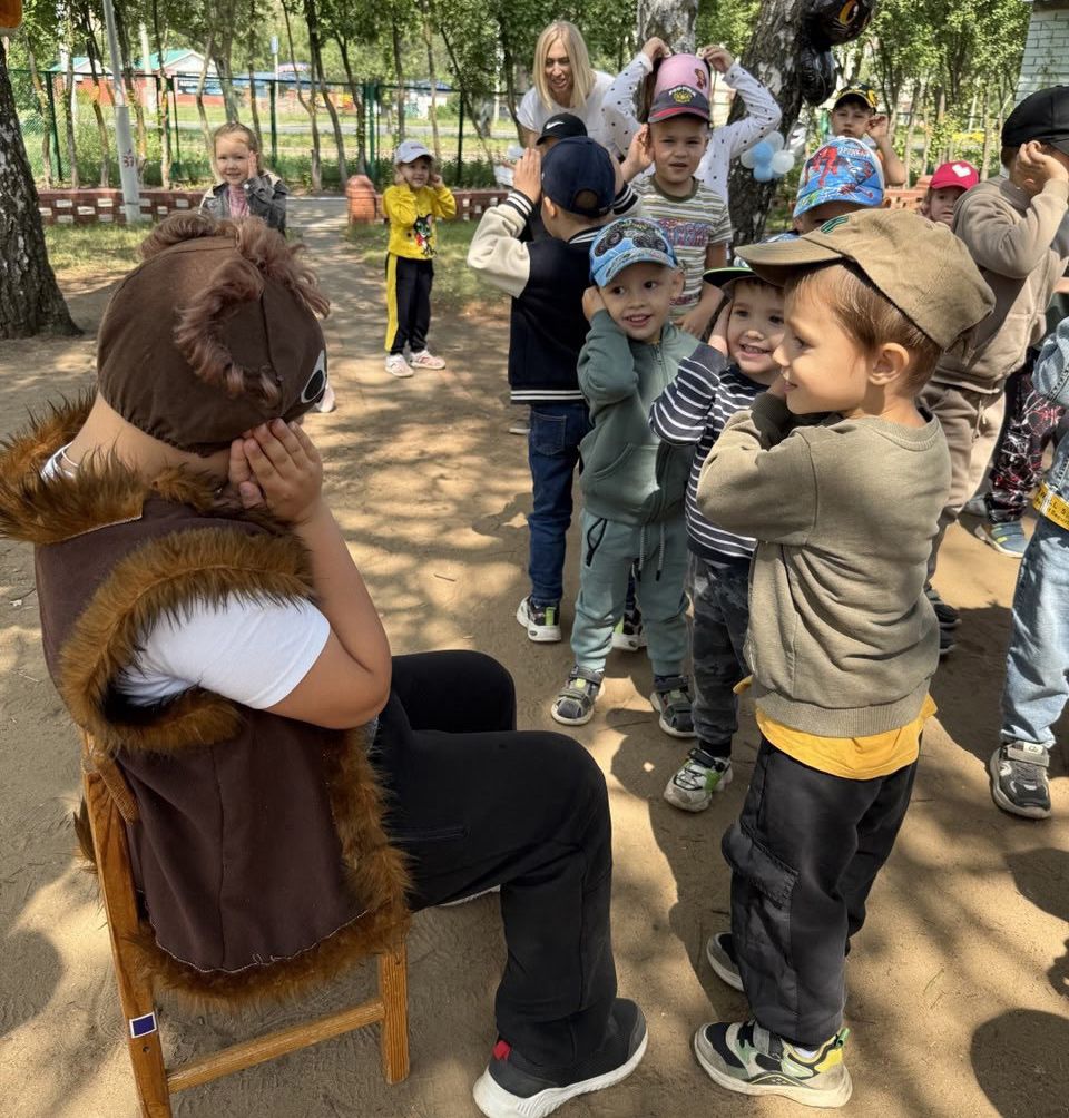 Дети с восторгом убегали от косолапого, а он, в благодарность за весёлую игру, угостил всех вкусными печеньками!