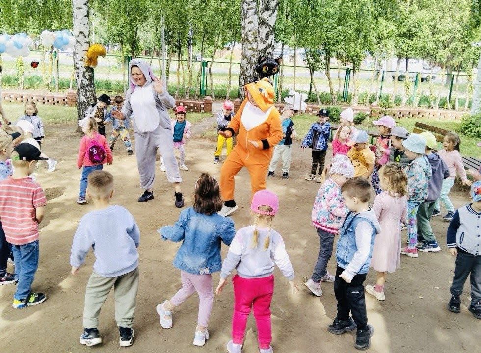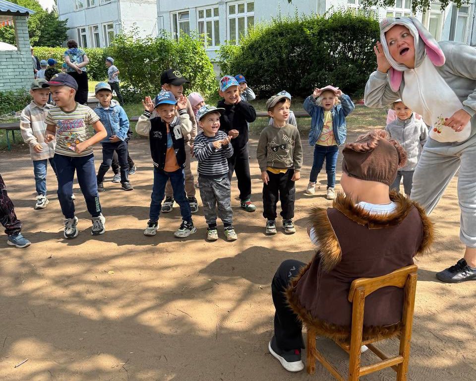 Наконец, паровозик привёз всех на зелёную лесную полянку, где ребята окунулись в мир природы. Они отгадывали загадки о лесных жителях, и вдруг… откуда ни возьмись появилась рыжая лисичка! Она поиграла с детьми в игру «Солнышко и дождик»– малыши весело прятались от «дождика» и радовались «солнышку».