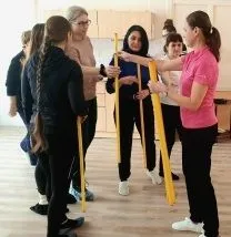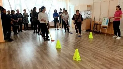 В процессе мастер-класса от педагогов из детского сада № 68 «Серебряное копытце» были представлены способы реализации задач физического воспитания через подвижную игру «Рингетт». Всем хорошо известен такой вид порта, как хоккей с клюшкой. А теперь давайте немного пофантазируем и представим: что вместо клюшки у нас в руках специальная палка, а вместо шайбы кольцо. Представили? И наверняка вы скажете, разве этим можно играть?! Можно! И наши педагоги с удовольствием освоили этот новый вид спорта. А командный дух, умение взаимодействовать, желание поддержать товарища, ответственность за свои действия и поведение в общей игре – это воспитательные ценности сотрудничества, которые развиваются в подвижную игру «Рингетт».