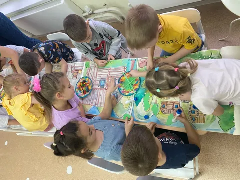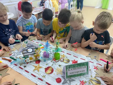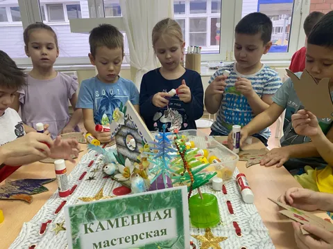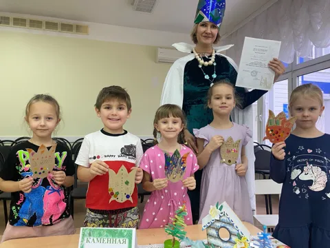 Сегодня ребята встретились с Хозяйкой Медной горы. Она пригласила ребят в свои владения, в творческие мастерские. Каждой группе ребят дала свое задание - и ребята справились, показали Хозяйке какие они творческие и трудолюбивые!