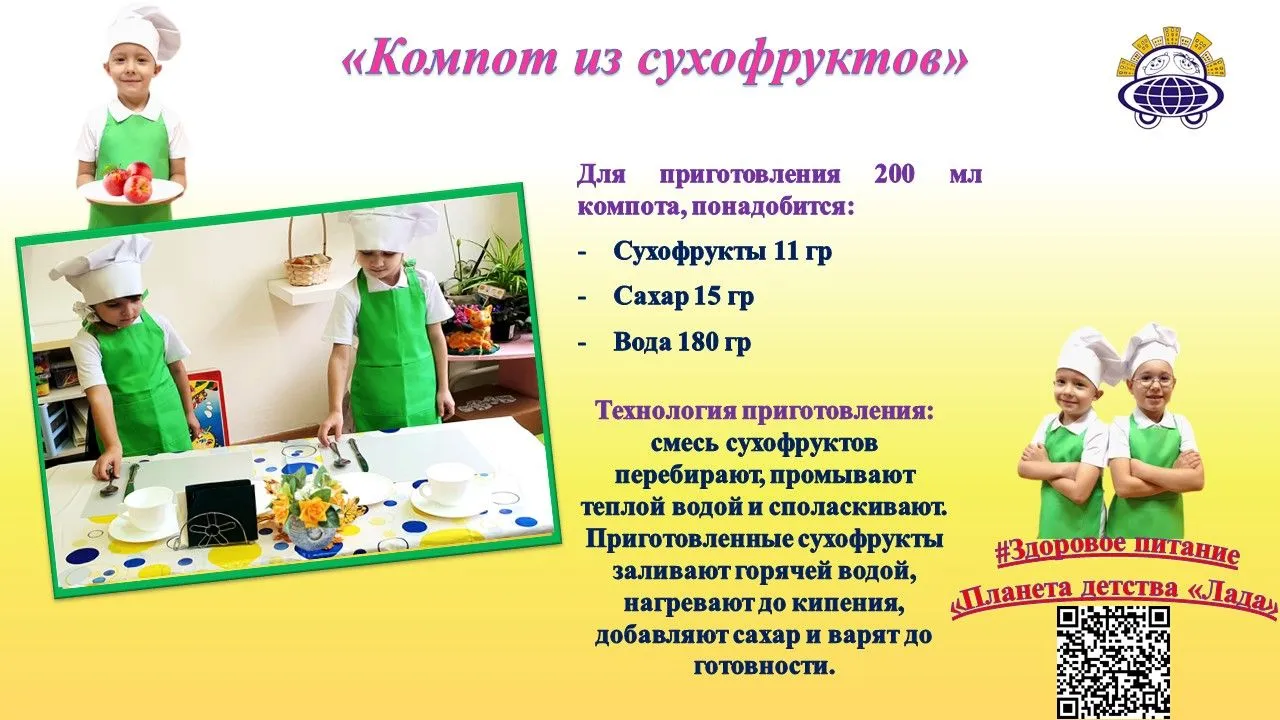 В детских садах АНО ДО «Планета детства «Лада» в меню для ребят на третье блюдо варятся компоты из яблок, сухофруктов, яблок и изюма.