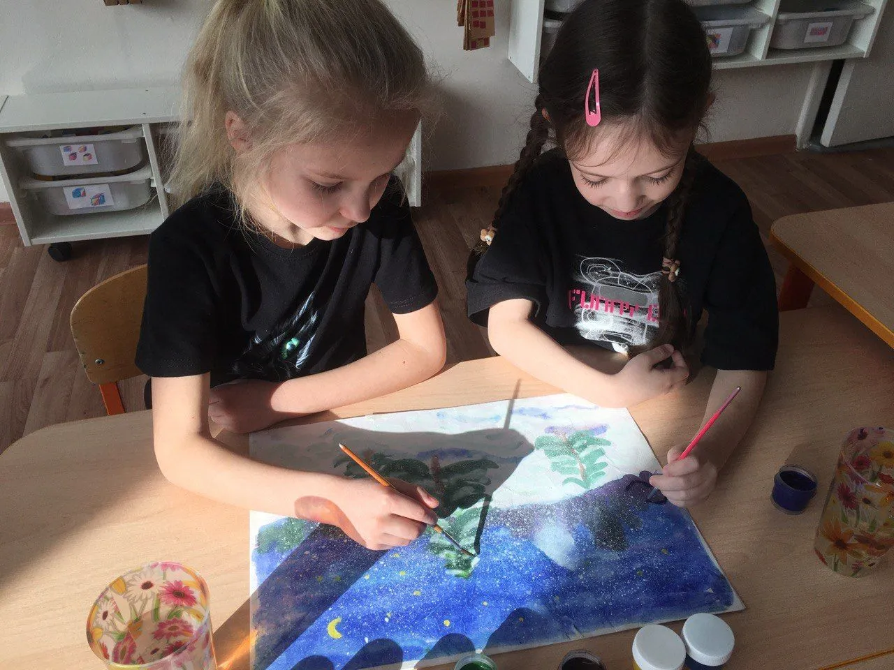 Яна: мы закрыли глаза, чтобы лучше почувствовать, о чем она. Когда зазвучало произведение «Весна.Осень», нам стало так тепло и радостно! Я нарисовала яркие цветы и бабочек, потому что весна — это время, когда всё расцветает. Маша добавила зелёные деревья и солнце. Потом мы представили «Осень». Эта музыка была такая меланхоличная, и я почувствовала, как листья падают с деревьев. Мы нарисовали золотые и красные листья, которые кружатся в воздухе. Маша сделала красивый пейзаж с деревьями.