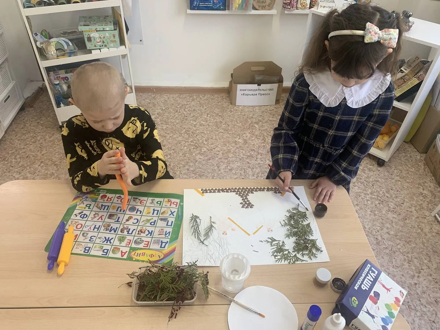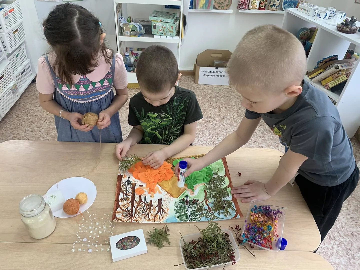 Воспитанники ДС № 106 Витя Е. с мамой Натальей Юрьевной, Аня Л., Давид Х., Саша М.под руководством Елены Александровны Кирилюк, использовали такие художественные материалы как воздушный пластилин, нитки, природный материал (сухоцветы, шишки).