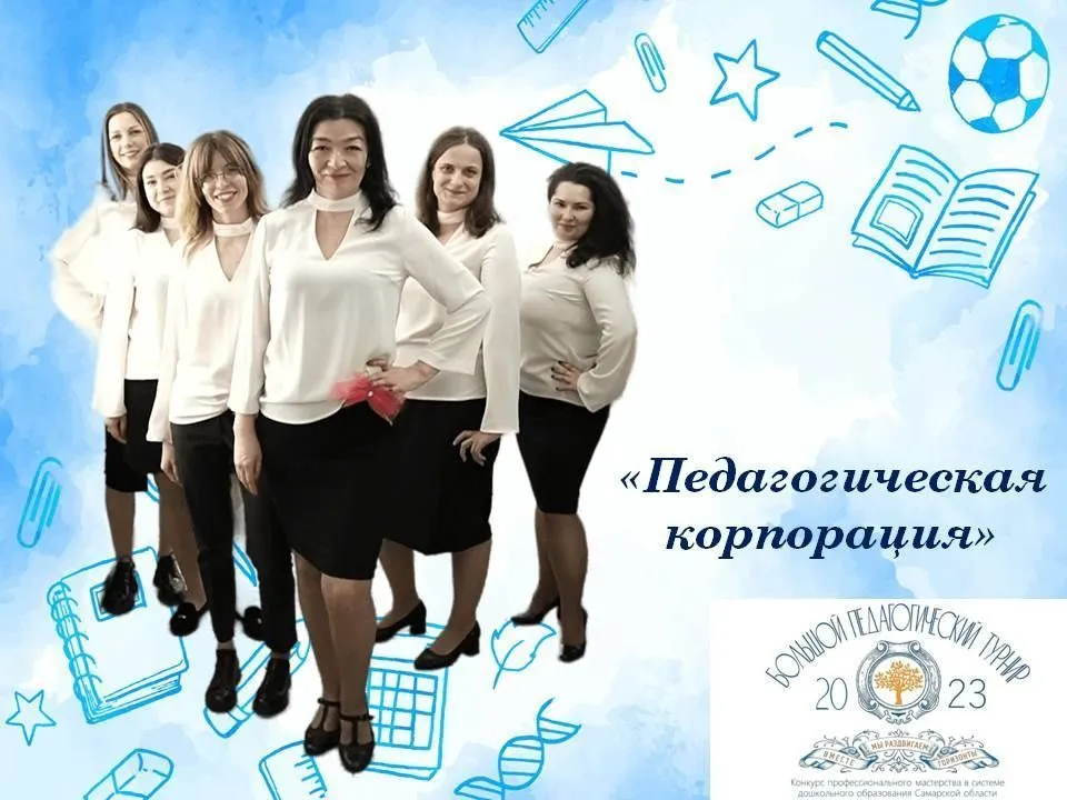 Еще одни участник Большого педагогического турнира 2023 года - команда "Педагогическая корпорация". Это педагоги детских садов № 149 «Елочка», №159 «Соловушка», №169 «Лесная сказка», №171 «Крепыш» АНО ДО "Планета детства "Лада". Их девиз: