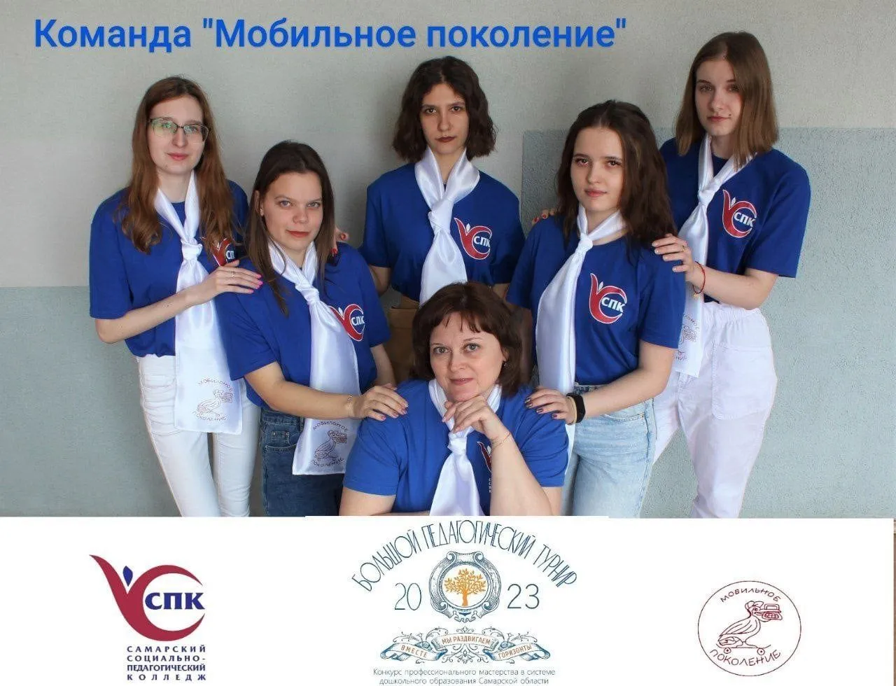 Команда "Мобильное поколение" из ГБПОУ «Самарского социально-педагогического колледжа» приветствует участников Большого педагогического турнира 2023. Девиз команды: «Мы поколение нового века, в наших руках судьба человека». В составе команды студенты 4 курса специальности "Специальное дошкольное образование". Важным для молодого педагога они считают умение быть мобильными и уметь подобрать подход к любому ребёнку, а также найти индивидуальный подход к родителям и уметь сотрудничать с коллегами ДОУ.