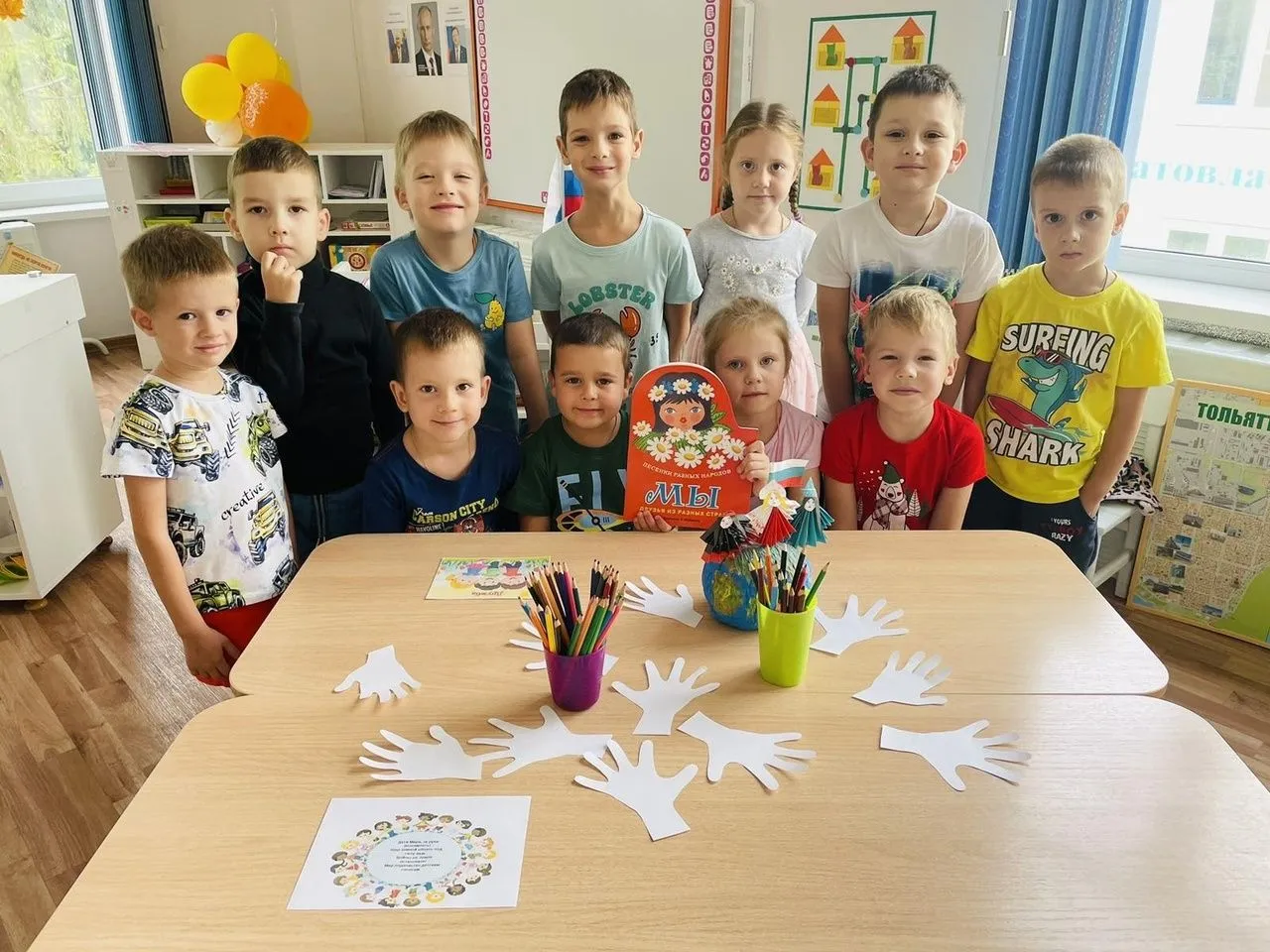 А ребята своими руками выполнили необычный хоровод из ладошек "Дружные ладошки".