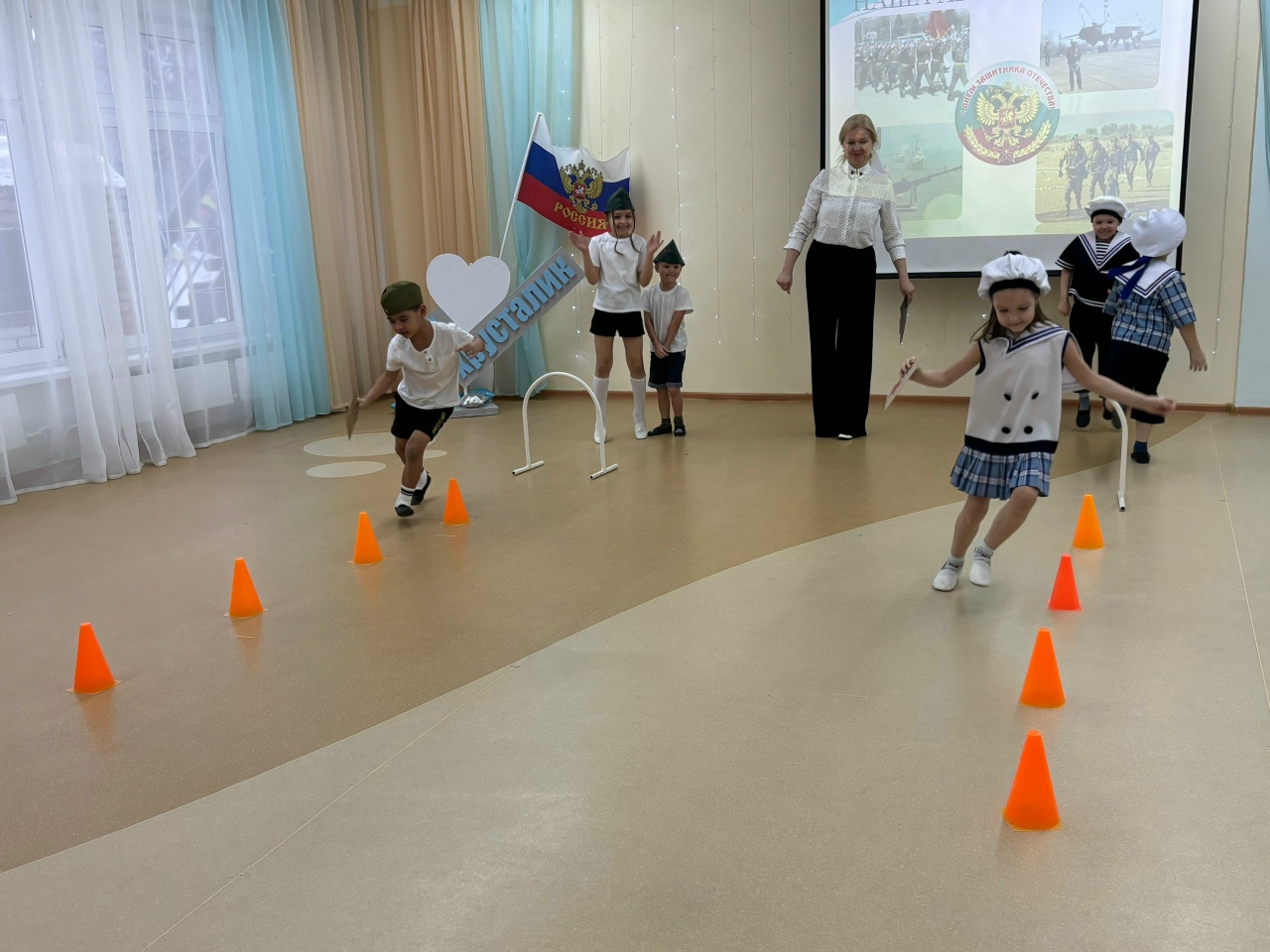 Дети беседовали о родах войск, отгадывали военные загадки, пели песни, танцевали, а также проходили необычные препятствия. Это - «Доставь груз до военной базы» «Внимательный водитель», «Метай гранату!». Каждый из ребят получил массу положительных эмоций!