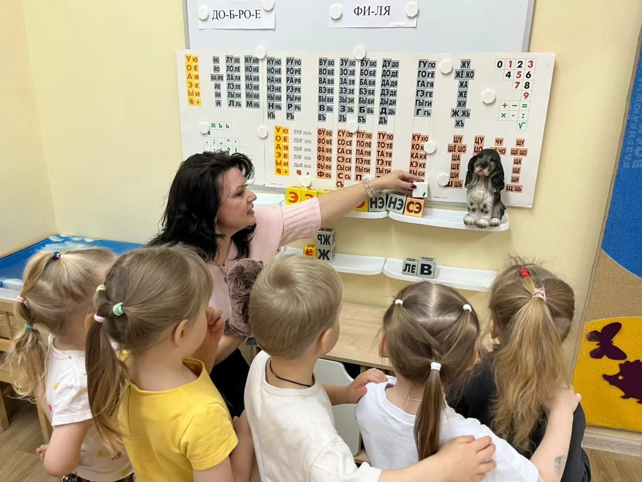Пока Филя играл с другом, ребята тоже не теряли времени, и составляли слова из кубиков, ориентируясь на картинку.