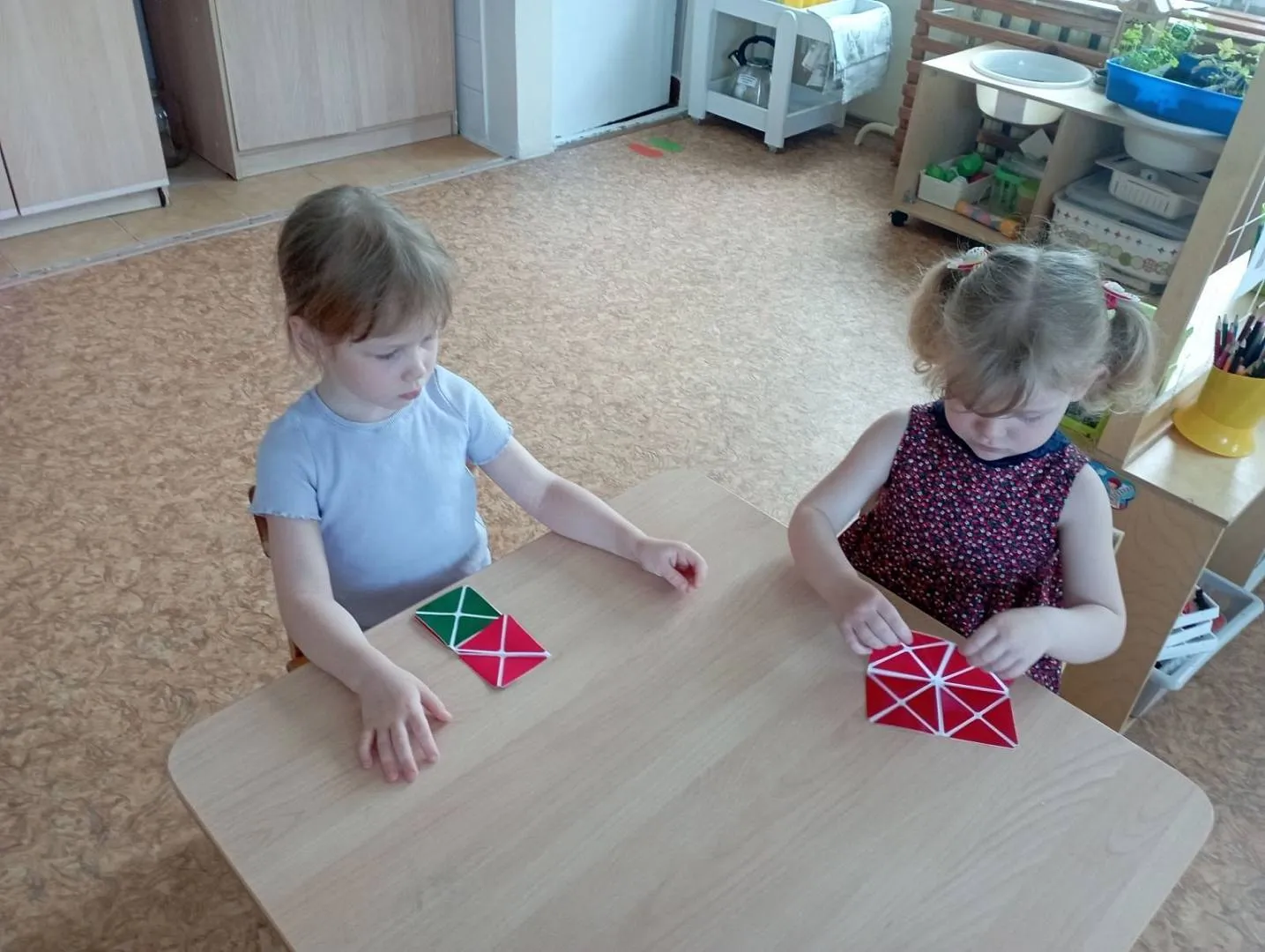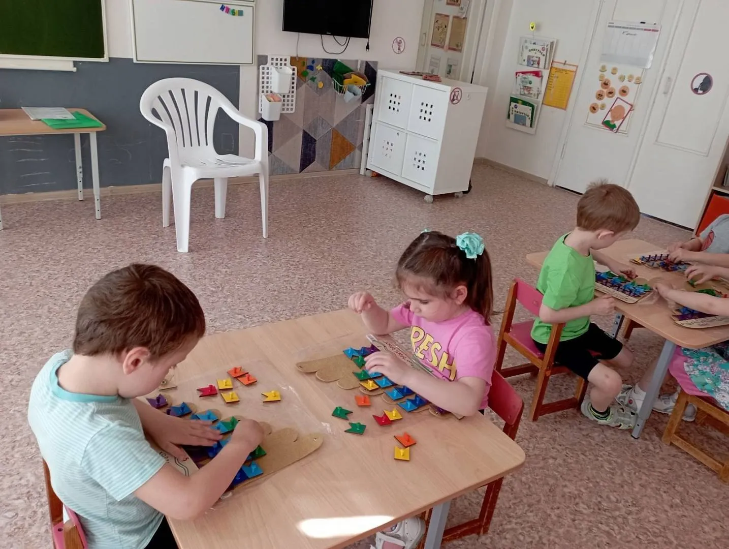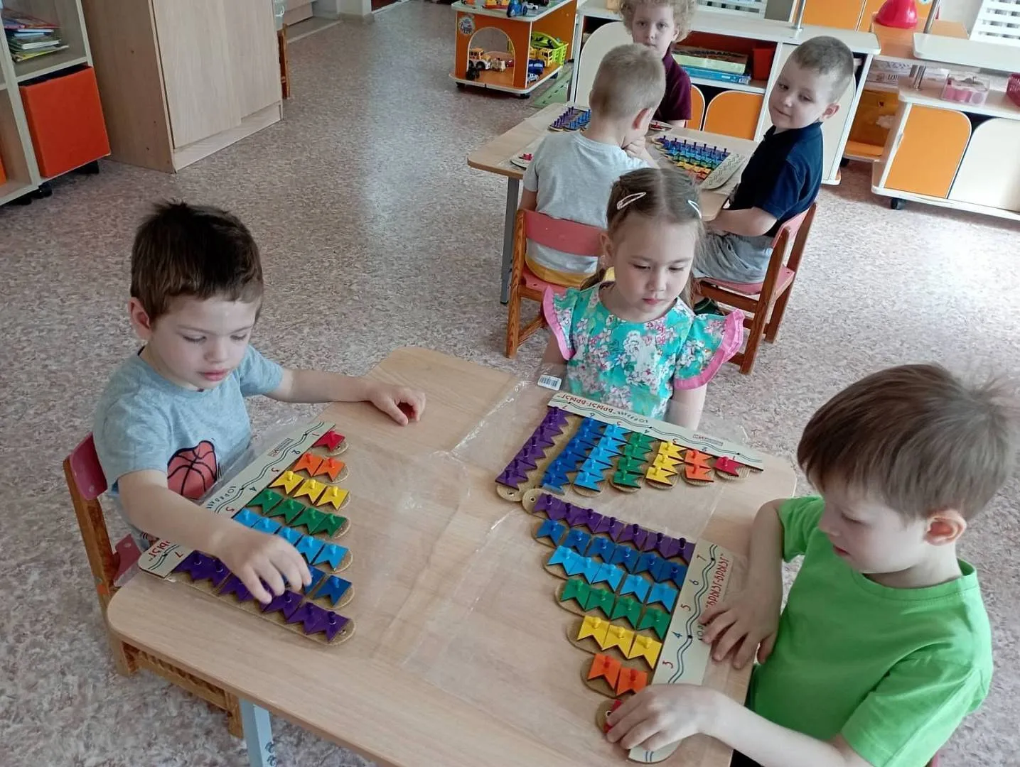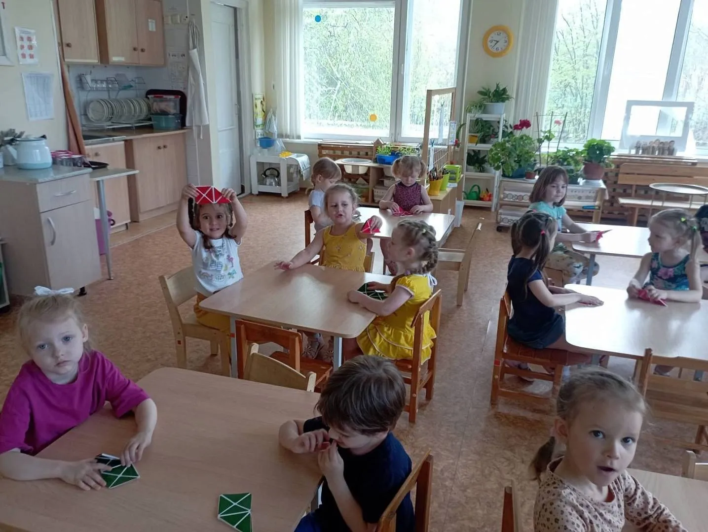 Дети средней группы 92 играли в игру-считалку "Шел домой Глеб" (находили количество съеденных Глебом крошек и увиденных им кошек), помогали Ёжику-единичке и Зайчику- двойке пройти по лабиринту цифр в свои номера в гостинице, а также превращали волшебный квадрат в разные фигурки. Ребята 93 группы под командованием капитана Гуся стирали, а потом развешивали разноцветные флажки на мачты караблика Брызг-брызг, закрепляя счёт и цвет. Мальчики и девочки 94 группы вместе с малышом Гео и пауком Юком играли разноцветными паутинками на чудесной полянке золотых плодов - "Геоконте". Они познакомились с треугольником, строили разные многоугольники.