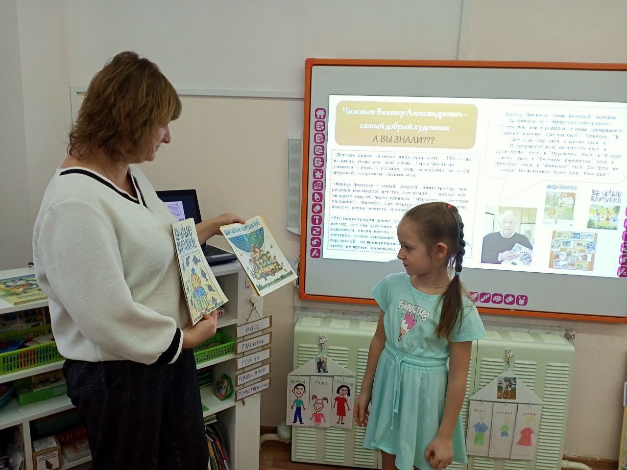 Ребята в игровой форме закрепили полученные знания, побеседовали об интересных фактах биографии художника, рассмотрели иллюстрации и книги В. Чижикова, ответили на познавательные вопросы викторины "Художник-иллюстратор как профессия".
