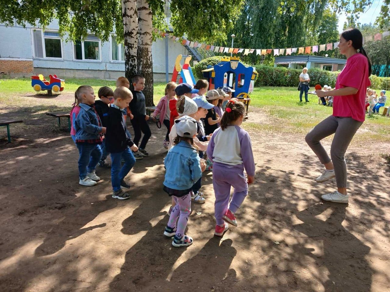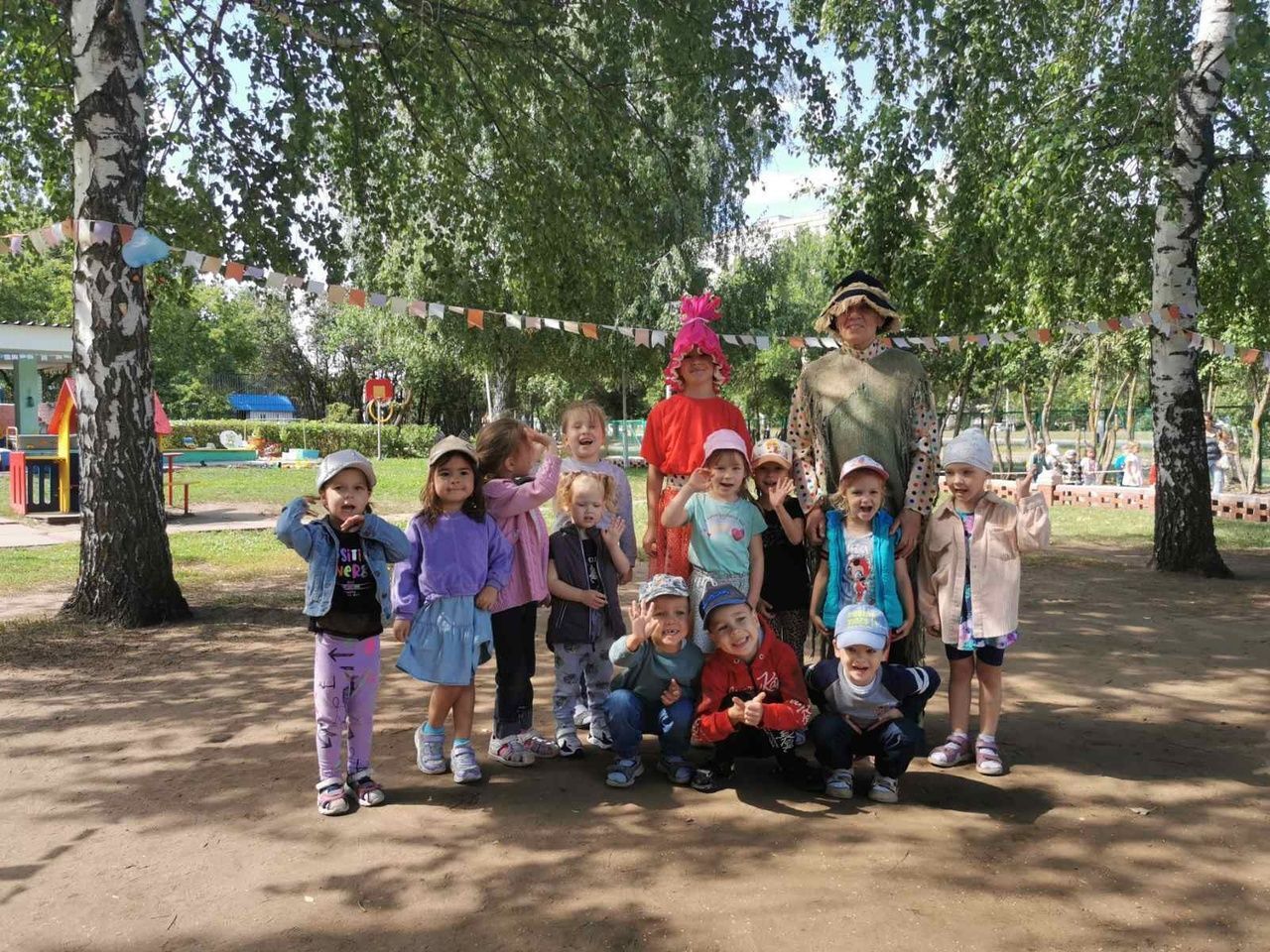 Дети "отправились" в лес, там они танцевали и радовались, пели песню про солнышко, как вдруг на шум в лесу пришёл Лесовичок и был недоволен, что у него названные гости. А все потому, что кто-то пришёл до ребят и сильно намусорил на лесной полянке. Ребята предложили ему свою помощь и навести порядок. А взамен попросили его показать им грибные и ягодные места. Лесовичок был рад такому предложению и позвал свою подружку Малинку. Все герои и дети веселились, играли, собирали ягоды, грибы! Малинке так понравились детишки, что она угостила их "вкусняшками"! После чего ребята отправились обратно в детский сад.