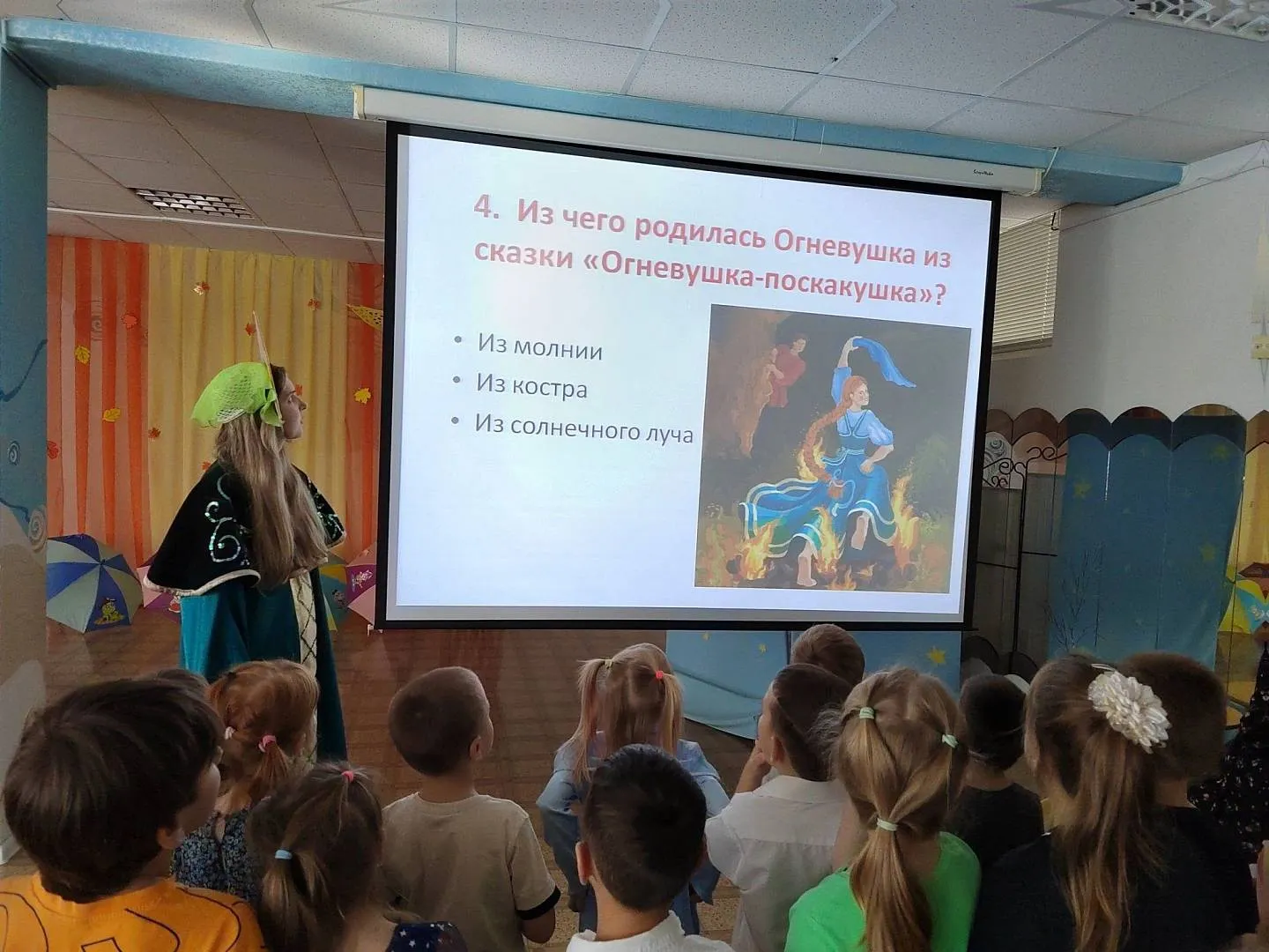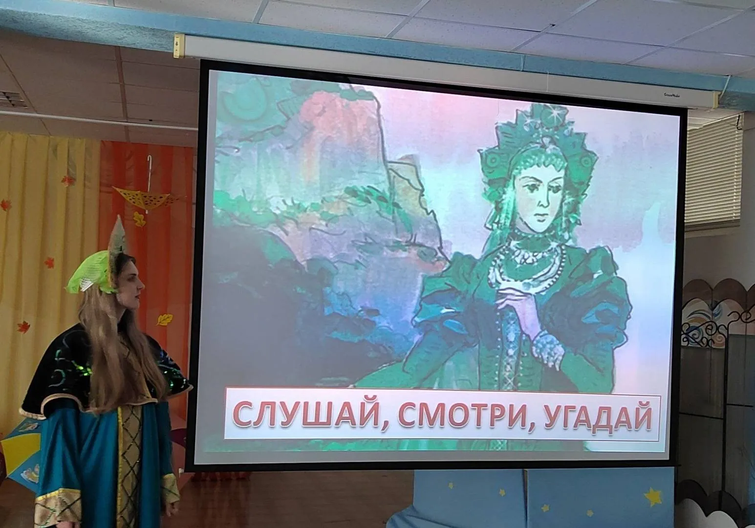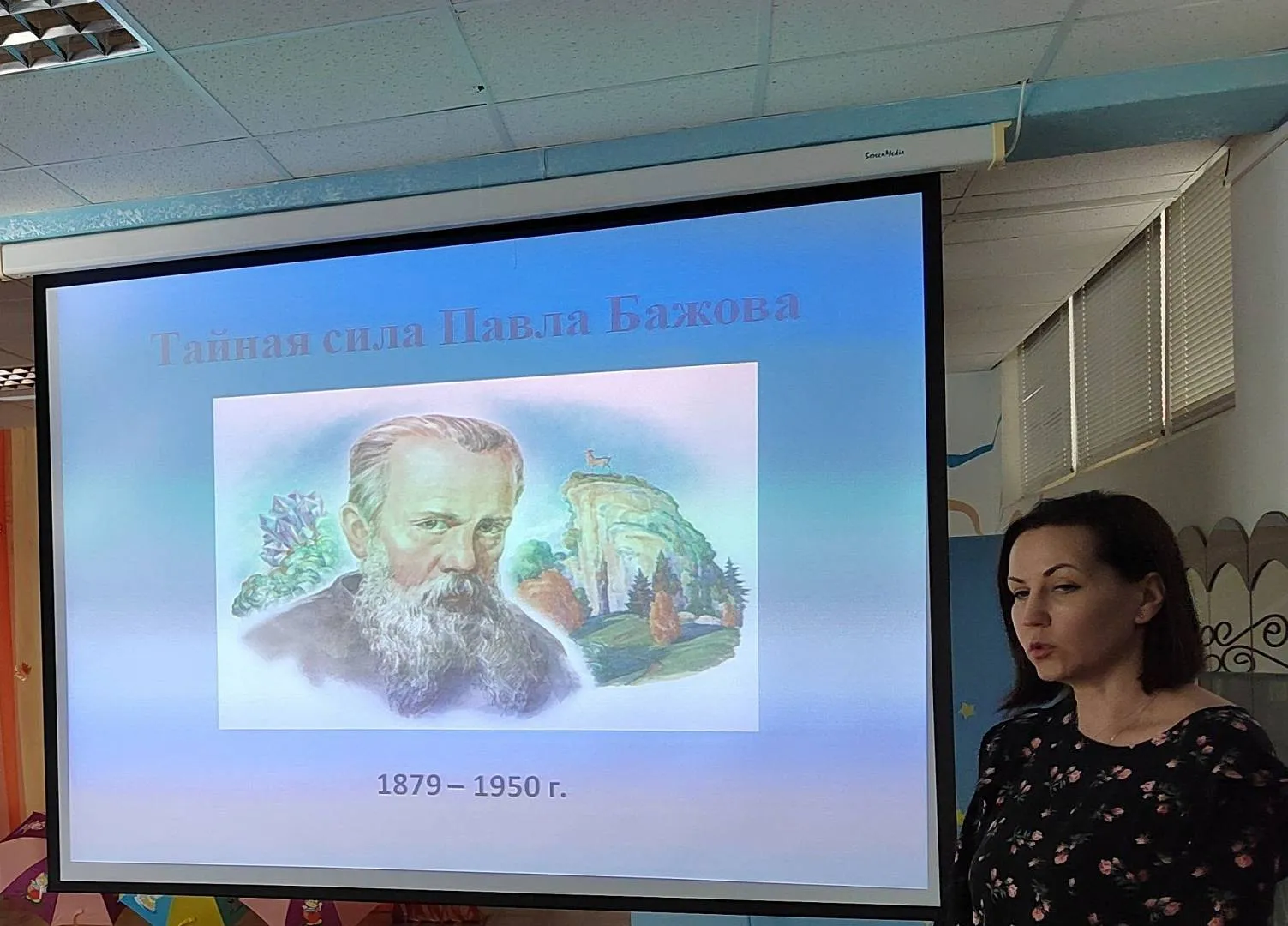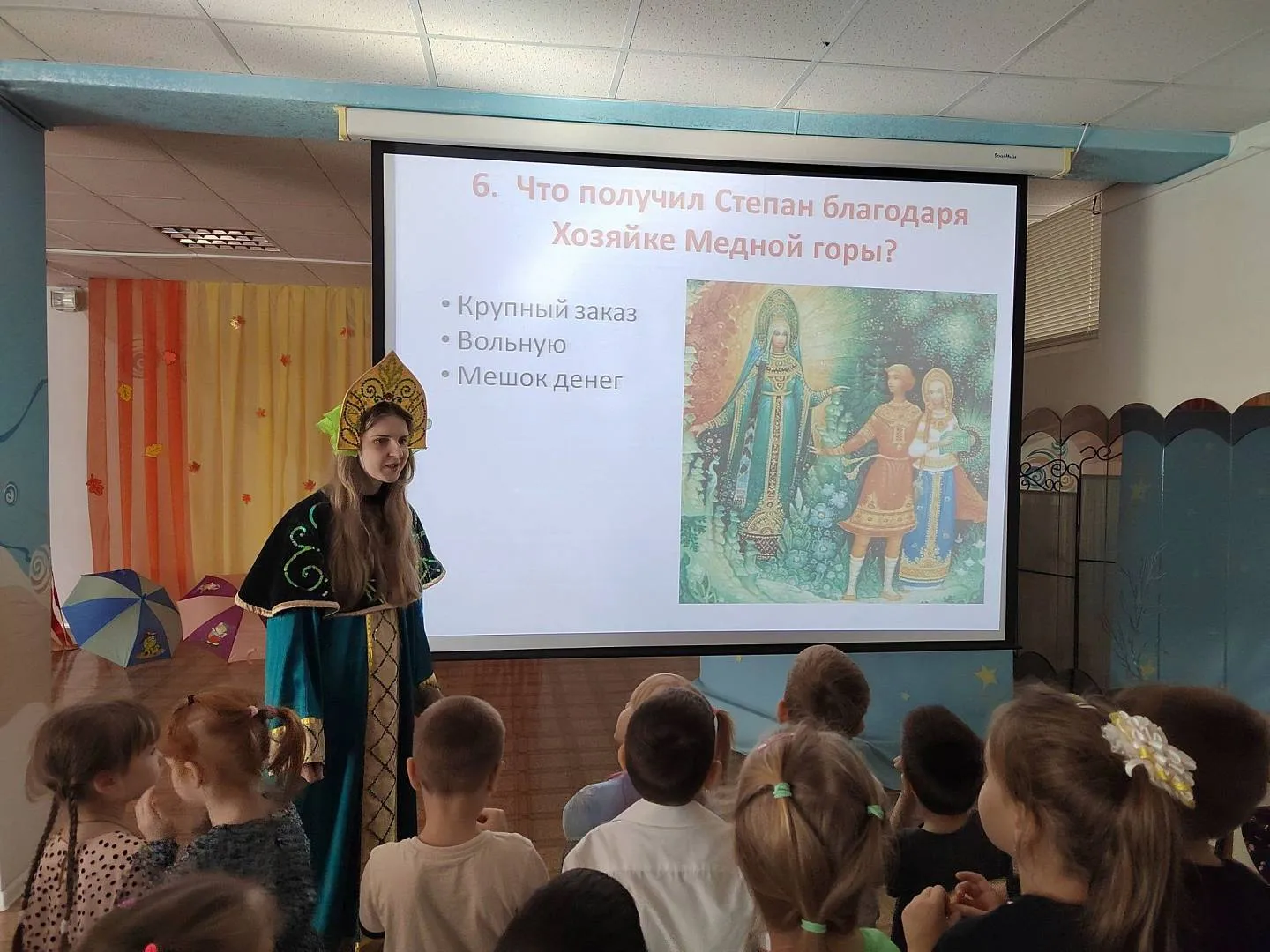 Сегодня детям рассказали об уральском сказочника Павле Петровиче Бажове, его биографии и, конечно, о его необыкновенных сказах. Мероприятие посетила сама Хозяйка Медной горы и провела с детьми интерактивную игру "Слушай, смотри, угадай". Хозяйка Медной горы была приятно удивлена, что дети знакомы с произведениям П. Бажова и давали верные ответы на вопросы.