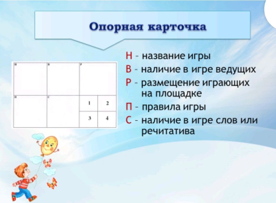 В детском саду № 99 "Капелька" реализуется «Технология развития самостоятельности в организации подвижных игр», которая была разработана под руководством Аллы Анатольевны Ошкиной, к.п.н., доцента Тольяттинского государственного университета. Нами было найдено эффективное средство решения проблемы - это опорная карточка. Она состоит из шести секций - окошечек, в каждом из которых в виде моделей представлены все структурные компоненты подвижной игры: Н - название, В- наличие в игре водящего, Р - расстановка игроков на игровом поле и размещение оборудования (при его наличии), П - правила игры, С - наличие в игре слов или речетатива, 6 окошко - возможные варианты подвижной игры. Для занесения содержания подвижной игры на карточку используем прием "моделирование". Это перенос реальности на знаково - символический язык. Таким образом, карточки становятся для ребенка наглядной опорой в ходе организации подвижной игры.