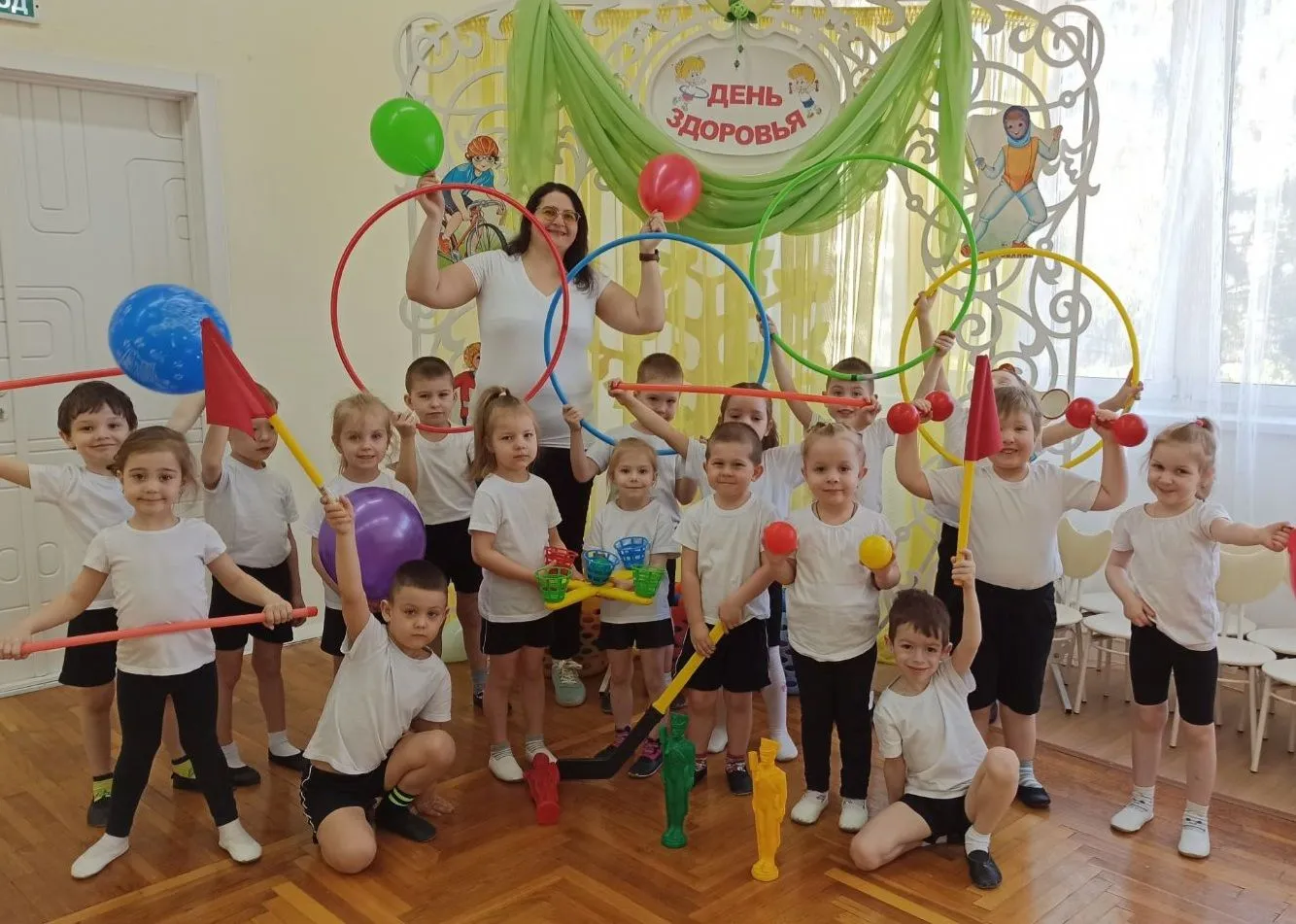 Весь день дети путешествовали по разным станциям страны Здоровья. Малыши попали в город Витаминдию, где встретились с доктором Айболитом. Ребята поиграли с ним в игру с разноцветными мячами и получили в подарок полезные витамины.